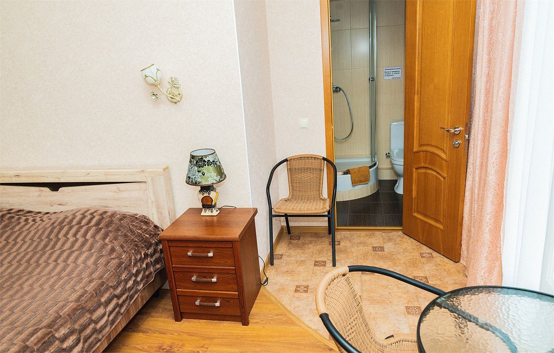 Двухместный номер «Комфорт» Уютный номер с террасой - идеальное пространство для пар, где продуманный комфорт сочетается с атмосферой уединения и отдыха. Здесь есть всё необходимое для приятного проживания: от качественного сна до расслабляющих вечеров на свежем воздухе. Почему стоит выбрать этот номер: • просторная двуспальная кровать для полноценного отдыха; • собственная терраса — отличное место для утреннего кофе или вечерних посиделок; • продуманное оснащение для комфортного быта; • гармоничная обстановка, создающая ощущение домашнего уюта. В номере предусмотрено: • двуспальная кровать; • кондиционер; • телевизор; • мини холодильник; • душевая кабина; • шкаф для одежды; • фен; • электрочайник; • постельные принадлежности; • банные принадлежности; Этот номер — баланс функциональности и уюта, созданный для того, чтобы вы чувствовали себя комфортно и могли по настоящему расслабиться во время пребывания в отеле.Услуги и удобства