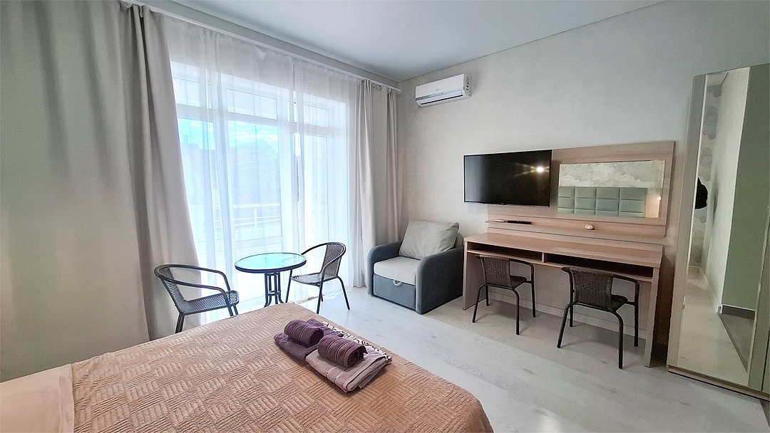 Трёхместный номер «Комфорт» Просторный, современный и уютный номер с балконом — отличное решение для пары или семьи из трёх человек. Здесь продумана каждая деталь: достаточно места для комфортного размещения, функциональная мебель и всё необходимое для приятного отдыха. Почему стоит выбрать этот номер: • оптимальное размещение для трёх гостей: двуспальная кровать и дополнительное спальное место (раскладное кресло); • собственный балкон — идеальное место для утреннего кофе или вечерних посиделок на свежем воздухе; • продуманная планировка, сочетающая удобство и функциональность; • уютная атмосфера, способствующая расслаблению и отдыху. В номере предусмотрено: • двуспальная кровать; • раскладное кресло; • кондиционер; • телевизор; • мини холодильник; • душевая кабина; • шкаф для одежды; • фен; • электрочайник; • постельные принадлежности; • банные принадлежности; Этот современный номер сочетает в себе простор, уют и функциональность — всё, чтобы ваше пребывание в отеле было максимально комфортным и запоминающимся.Услуги и удобства