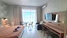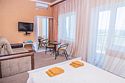 телевизор, спутниковое телевидение, Wi-Fi, холодильник, кондиционер, душевая кабина, санузел, банные полотенца, балкон, терраса, две односпальные кровати, диван, тумбы, шкаф для одежды, журнальный столик, ковер, чайник, унитаз, мягкая мебель, ковровое покрытие, душ, вид на море, туалет, сплит-система, диван-кровать, номер для некурящих, пуфик, можно с питомцамиВ гостиничном номере