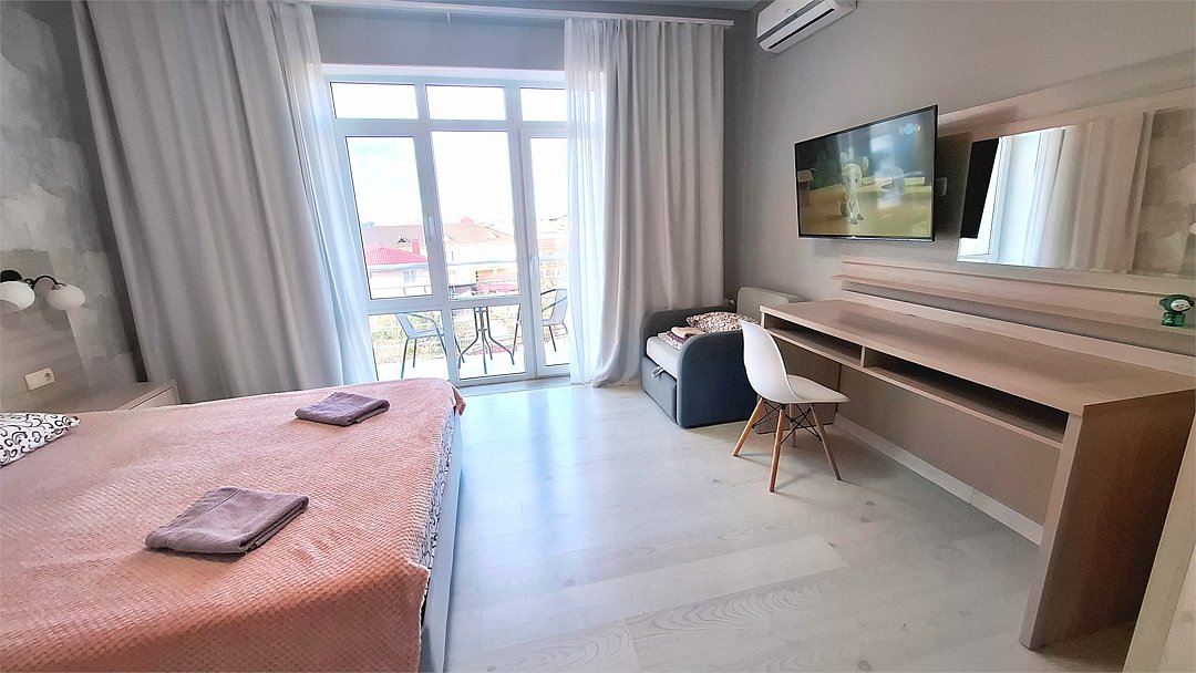 Предлагаем Вашему вниманию 3-х местный номер комфорт в уютном нашем 4 корпусе "Крымское Чудо" который находиться за 350м от моря и 400м от основного корпуса с бассейном, который идеально подходит для спокойного семейного отдыха вблизи Черного моря. Комфортные номера с кондиционером, частный двор, настольный теннис, мангал, тень от виноградной лозы - всё, что нужно для комфортного отпуска. При бронировании данного номера по тарифу с питанием - услуги питания предоставляются в Главном Корпусе отеля Лазурный Берег ( 400 метров ).Услуги и удобства