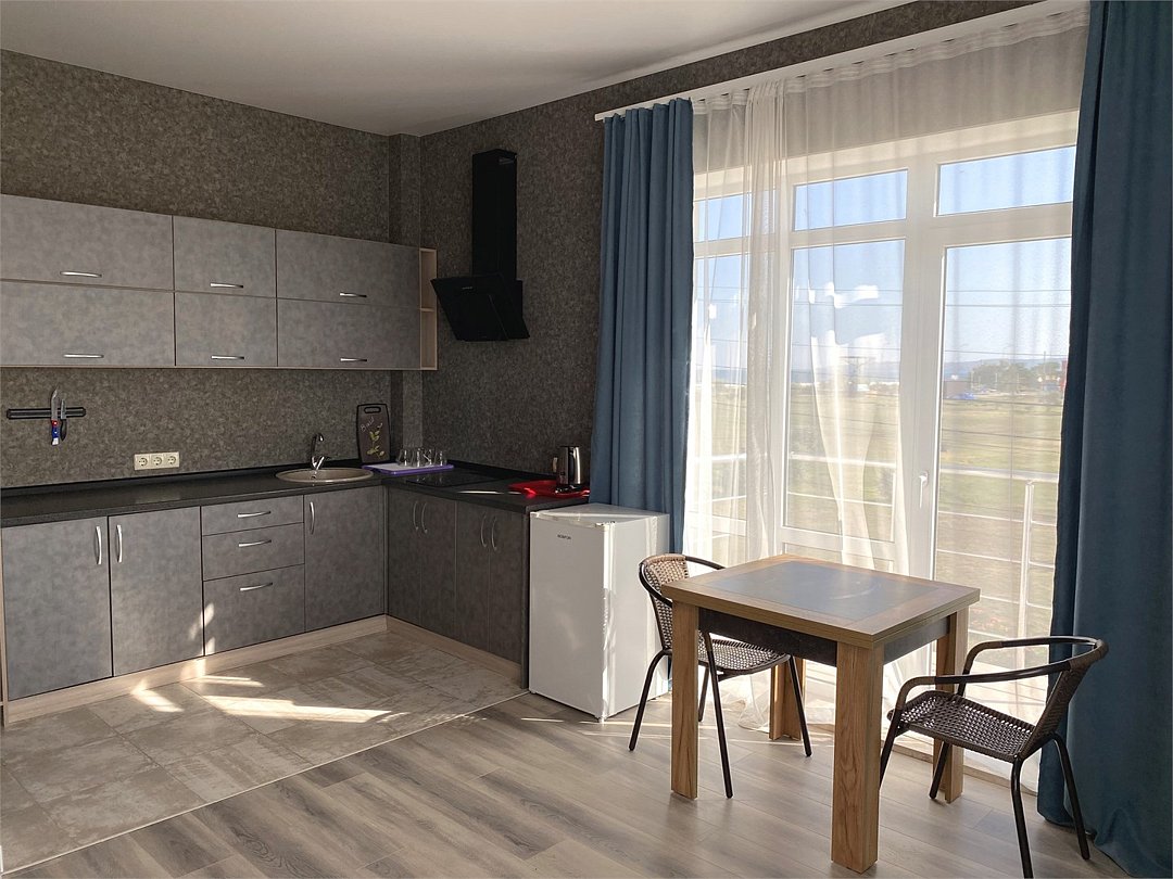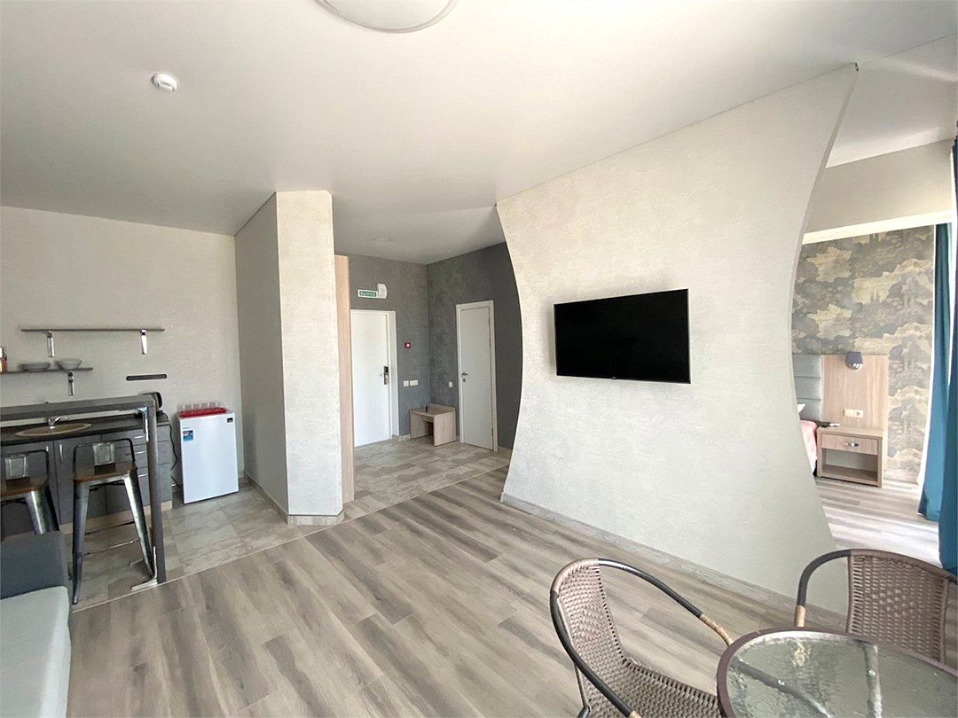 Двухкомнатный люкс с кухней и балконом Просторный современный люкс площадью 40 кв. м — ваше личное пространство для безупречного отдыха. Номер идеально подходит для размещения 2–5 гостей или большой семьи. Из окон открывается живописный вид на море или озеро, создающий особое настроение каждый день пребывания. Ключевые преимущества: • две комнаты — для сна и отдыха; • полноценная кухня для приготовления любимых блюд; • два балкона — в каждой комнате, чтобы наслаждаться видами в любое время; • современный дизайн и продуманная планировка; • достаточно места для комфортного размещения 5 человек. Оснащение номера: • Спальные места: двуспальная кровать и двуспальный диван; • Климат контроль: кондиционеры в каждой комнате; • Развлечения: телевизоры с плоским экраном в обеих комнатах; • Кухня: встроенный кухонный гарнитур с индукционной плитой, холодильником и полным набором необходимой посуды; • Удобства: балкон в каждой комнате, шкаф для одежды; • Гигиена и уход: фен, банные принадлежности; • Дополнительно: электрочайник, постельные принадлежности, пляжные принадлежности. Почему стоит выбрать этот люкс: • Комфорт для большой компании. Достаточно спальных мест и зон для отдыха, чтобы каждый чувствовал себя уютно. • Домашняя атмосфера. Собственная кухня позволяет готовить любимые блюда и экономить время на походах в кафе. • Панорамные виды. Балконы в каждой комнате — идеальное место для утреннего кофе или вечерних посиделок с живописным пейзажем. • Современное оснащение. Всё необходимое для длительного и комфортного проживания в одном номере. Этот люкс создан для тех, кто ценит простор, функциональность и уют. Здесь вы сможете по настоящему расслабиться, провести время с семьёй или друзьями и сделать ваш отдых незабываемым.Услуги и удобства