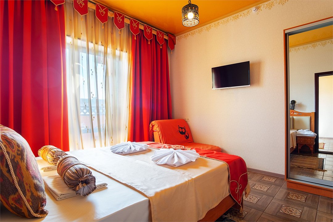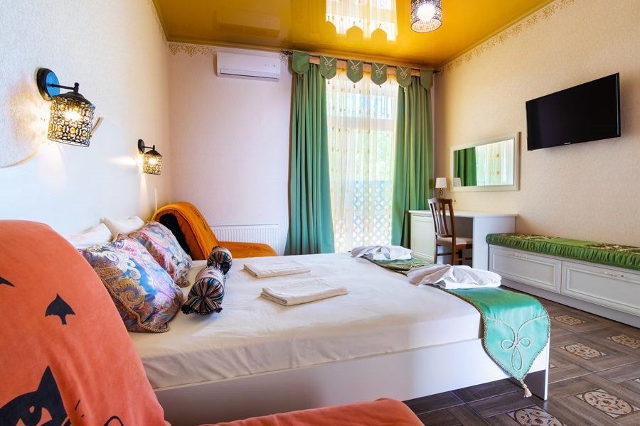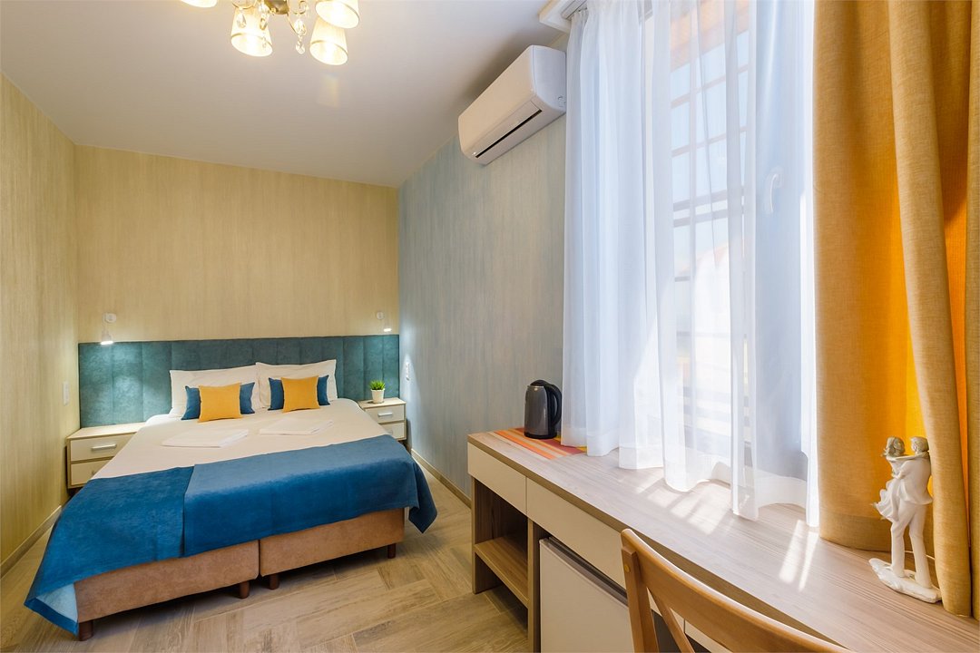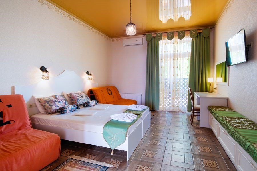 Wi-Fi, кондиционер, фен, ванна, теплый пол, банные полотенца, пляжные полотенца, две односпальные или большая двуспальная кровать, тумбы, шкаф для одежды, вешалки, письменный стол, набор посуды, чайник, унитаз, раковина, питьевая вода, отопление, плиточное покрытие, вид во двор, стул, раскладной диван, раскладное кресло, телевизор с плоским экраном, мини-холодильник, москитная сетка, гостиничная парфюмерия, можно с питомцамиВ гостиничном номере