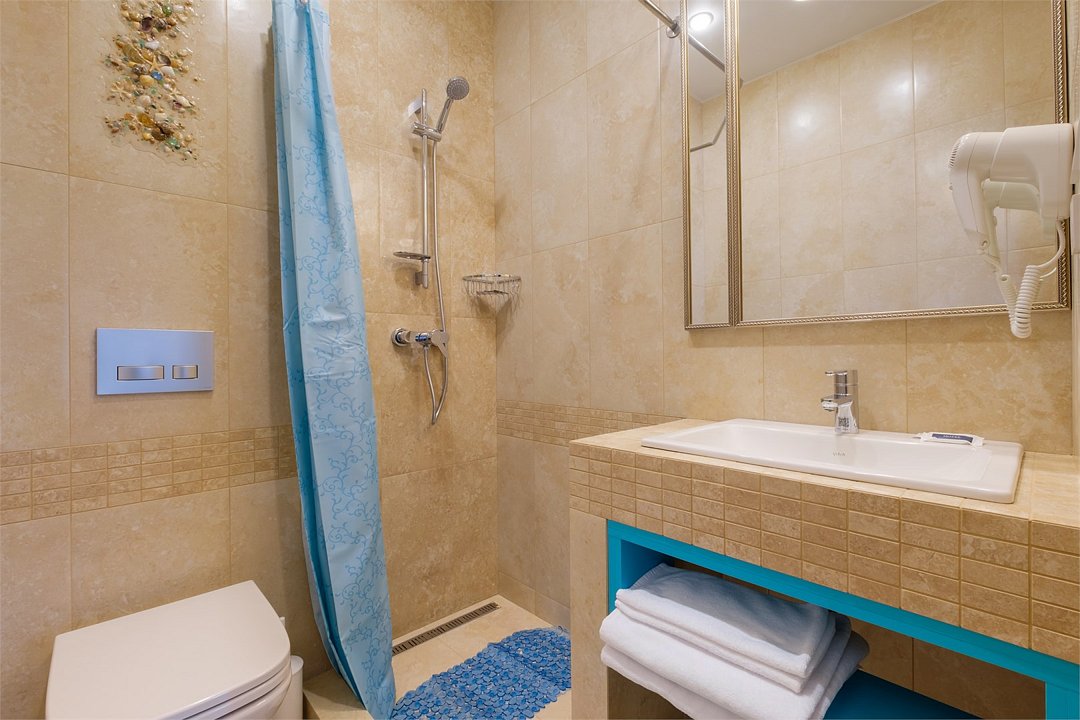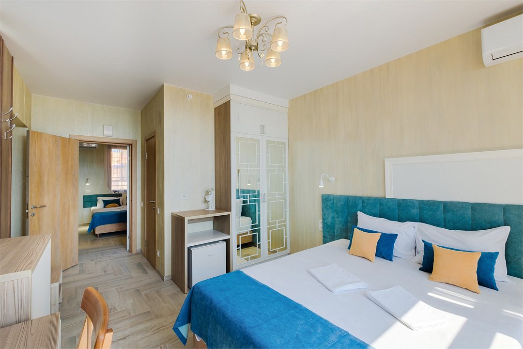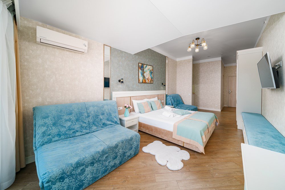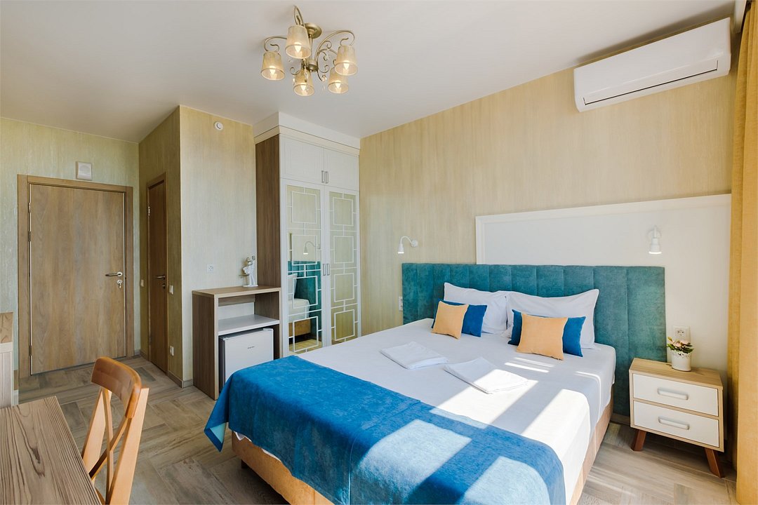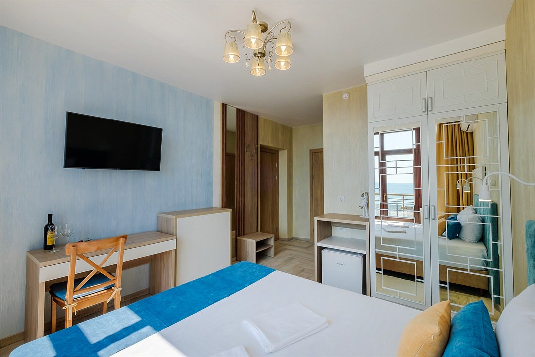 Wi-Fi, кондиционер, фен, теплый пол, банные полотенца, пляжные полотенца, две односпальные или большая двуспальная кровать, тумбы, шкаф для одежды, вешалки, письменный стол, две комнаты, сейф, чайник, унитаз, раковина, питьевая вода, отопление, душ, вид на море, плиточное покрытие, стул, телевизор с плоским экраном, мини-холодильник, москитная сетка, гостиничная парфюмерия, теплые полы, можно с питомцамиВ гостиничном номере