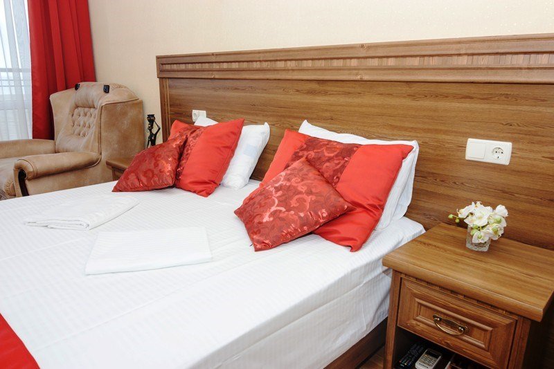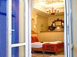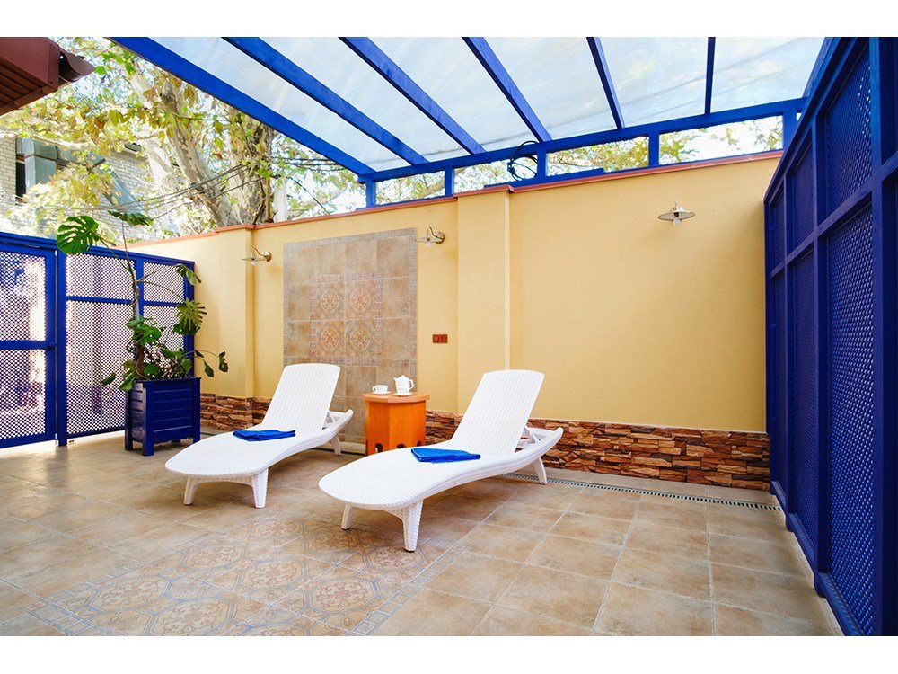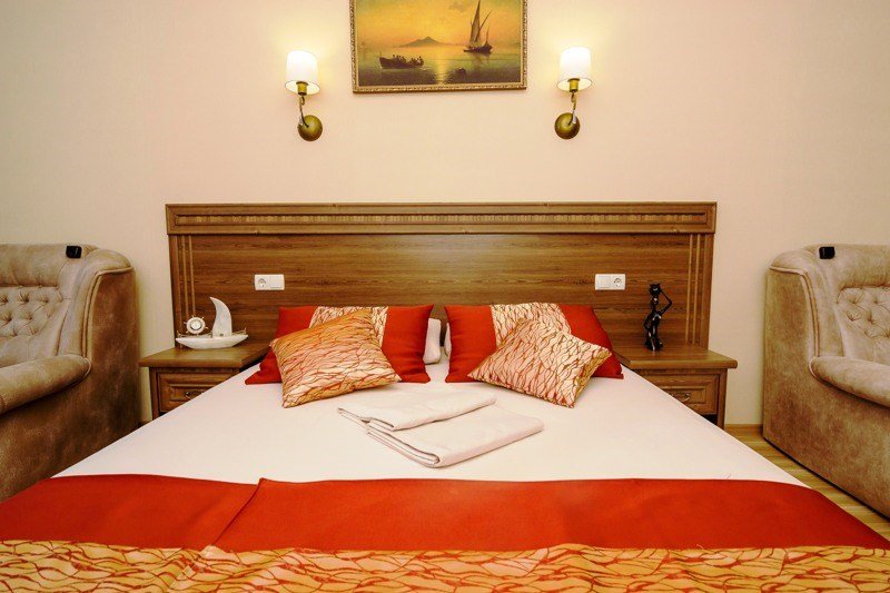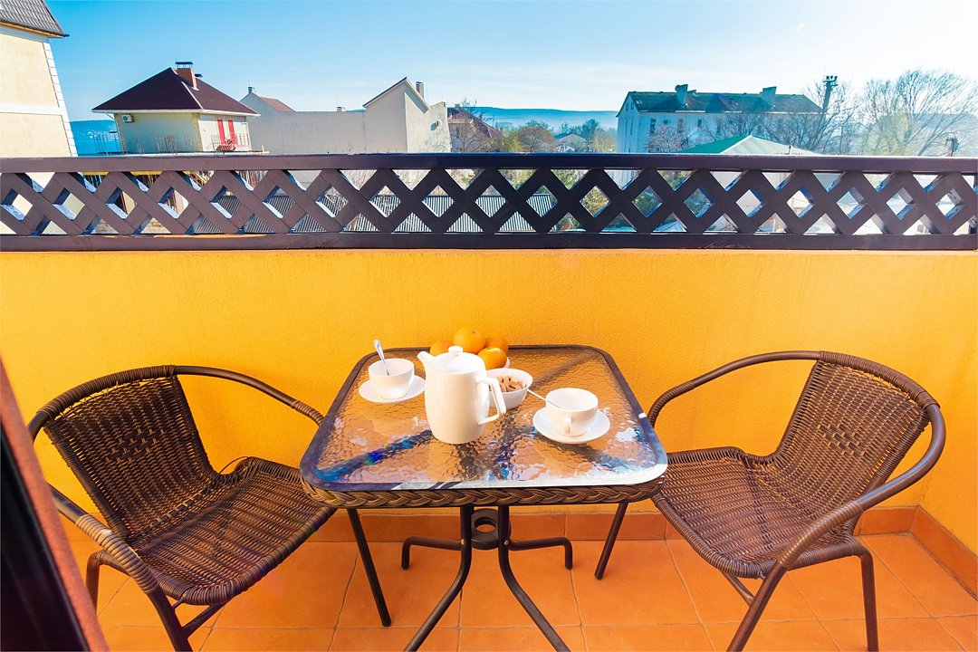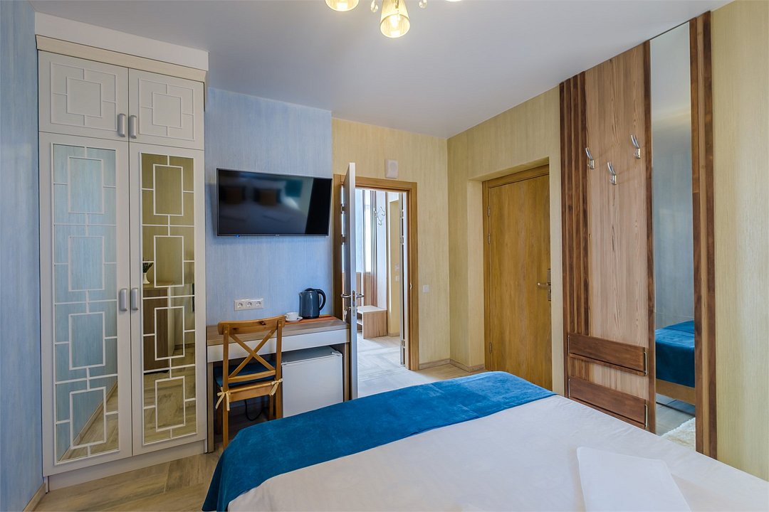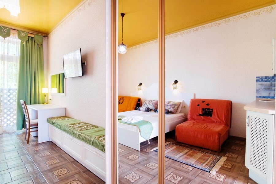 В номере: - Кровать (двуспальная или две односпальные) - Раскладной диван и раскладное кресло - Кондиционер - Сигнализация - Звукоизоляция - Сейф - Шкаф-купе - Стол письменный и стул - Прикроватные тумбочки Кухонная зона: - Холодильник - Электрочайник - Посуда (минимальный набор) - Микроволновая печь (по запросу) - Питьевая вода в номере Санузел: - Ванна - Туалет - Умывальник - Полотенца (банные и пляжные) - Мини-парфюмерия - Фен Услуги: - Частота уборки (1 раз в 3 дня или по требованию) - Смена постельного белья (1 раз в 3 дня или по требованию) Дополнительно: - Балкон общий - Пол: плиточный (с подогревом) - Москитная сетка, плотные шторы - Вид из номера: на двор Технологии: - Телевизор (плазменный, кабельное ТВ) - Доступ в Интернет (Wi-Fi)Услуги и удобства