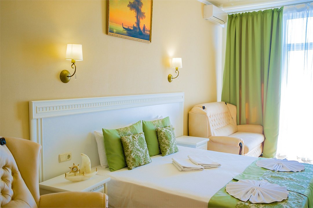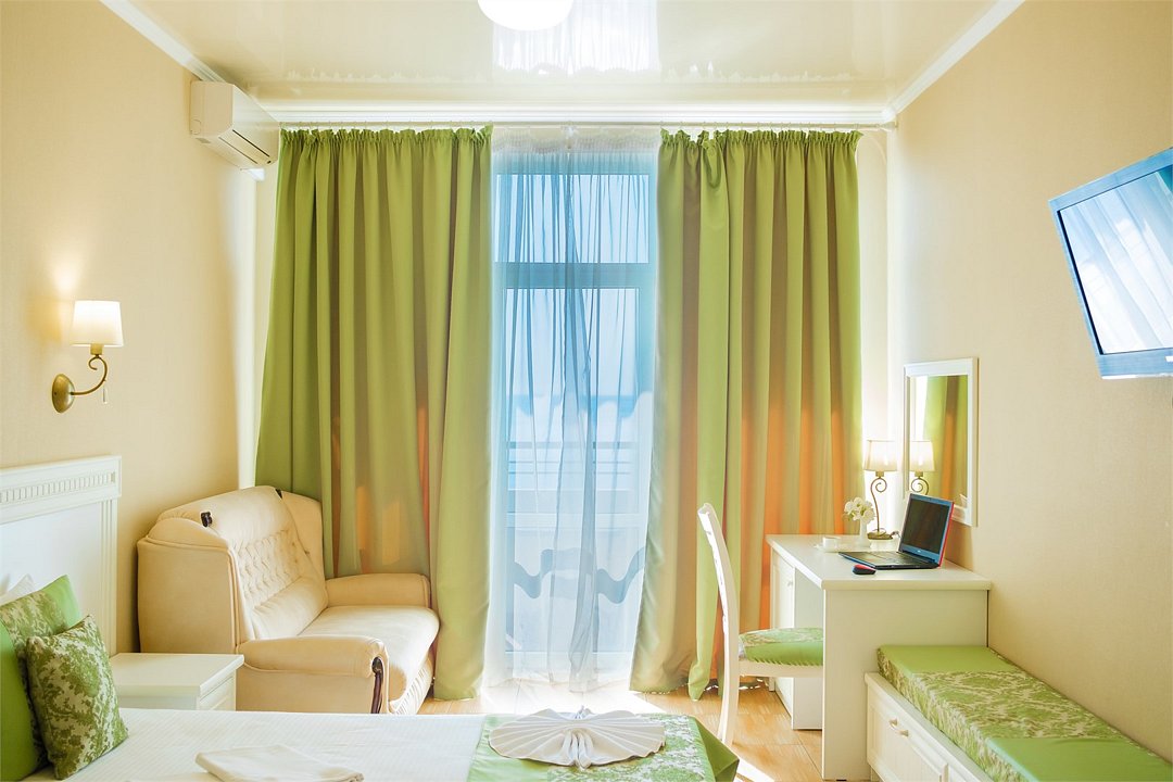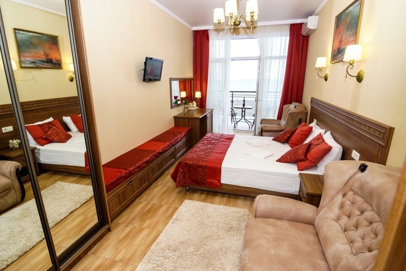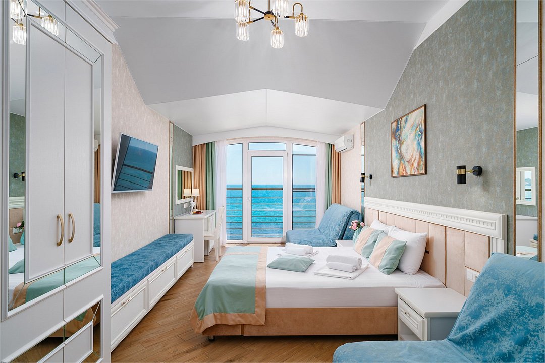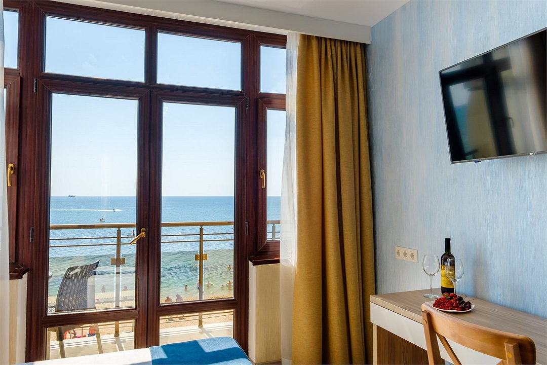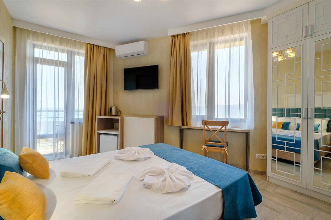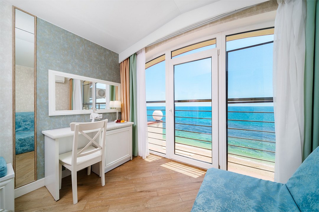 В номере: - Кровать (двуспальная или две односпальные) - Раскладной диван и раскладное кресло - Кондиционер - Сигнализация - Звукоизоляция - Сейф - Шкаф-купе - Стол письменный и стул - Прикроватные тумбочки Кухонная зона: - Холодильник - Электрочайник - Посуда (минимальный набор) - Микроволновая печь (по запросу) - Питьевая вода в номере Санузел: - Душ - Туалет - Умывальник - Полотенца (банные и пляжные) - Мини-парфюмерия - Фен Услуги: - Частота уборки (1 раз в 3 дня или по требованию) - Смена постельного белья (1 раз в 3 дня или по требованию) Дополнительно: - Пол: плиточный (с подогревом) - Москитная сетка, плотные шторы - Вид из номера: на море - Французское окно (не во всех номерах) - Без балкона Технологии: - Телевизор (плазменный, кабельное ТВ) - Доступ в Интернет Wi-FiУслуги и удобства