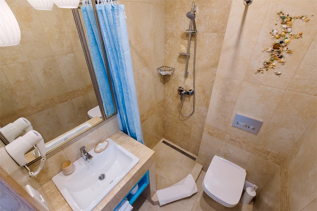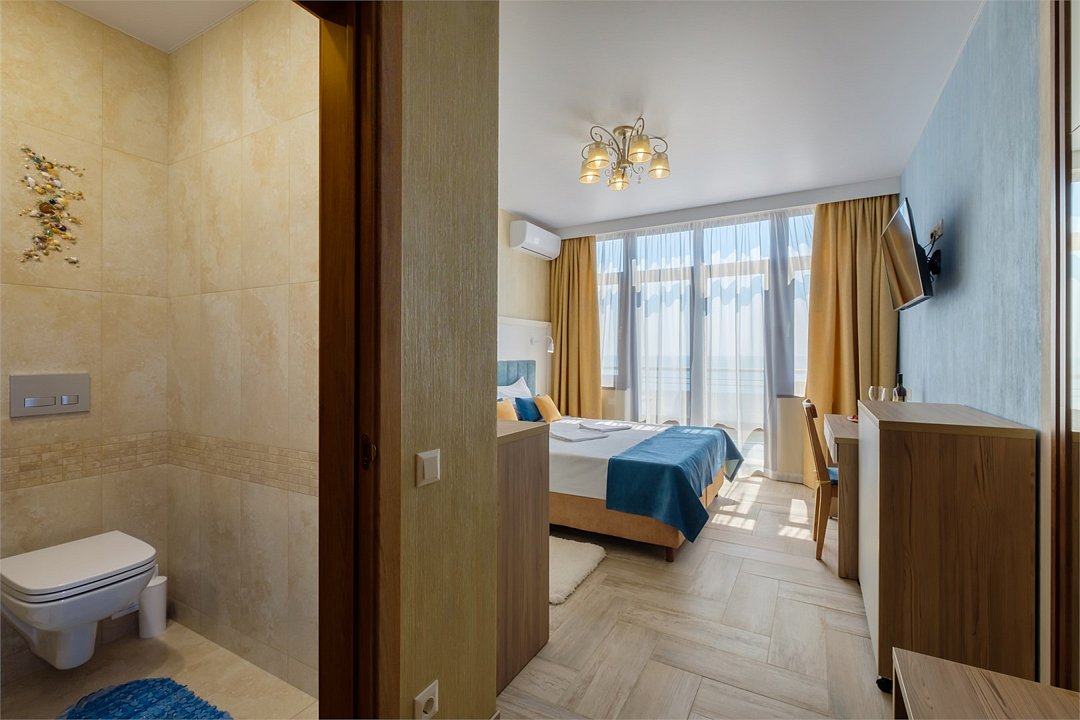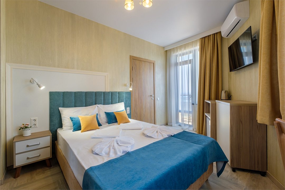 Wi-Fi, кондиционер, фен, теплый пол, банные полотенца, пляжные полотенца, балкон, две односпальные или большая двуспальная кровать, тумбы, шкаф для одежды, вешалки, письменный стол, набор посуды, чайник, унитаз, раковина, питьевая вода, отопление, душ, вид на море, плиточное покрытие, стул, раскладное кресло, телевизор с плоским экраном, мини-холодильник, москитная сетка, гостиничная парфюмерия, теплые полы, можно с питомцамиВ гостиничном номере