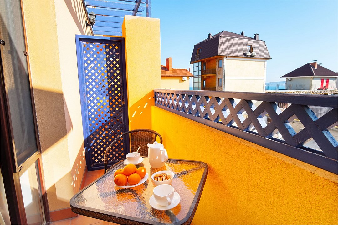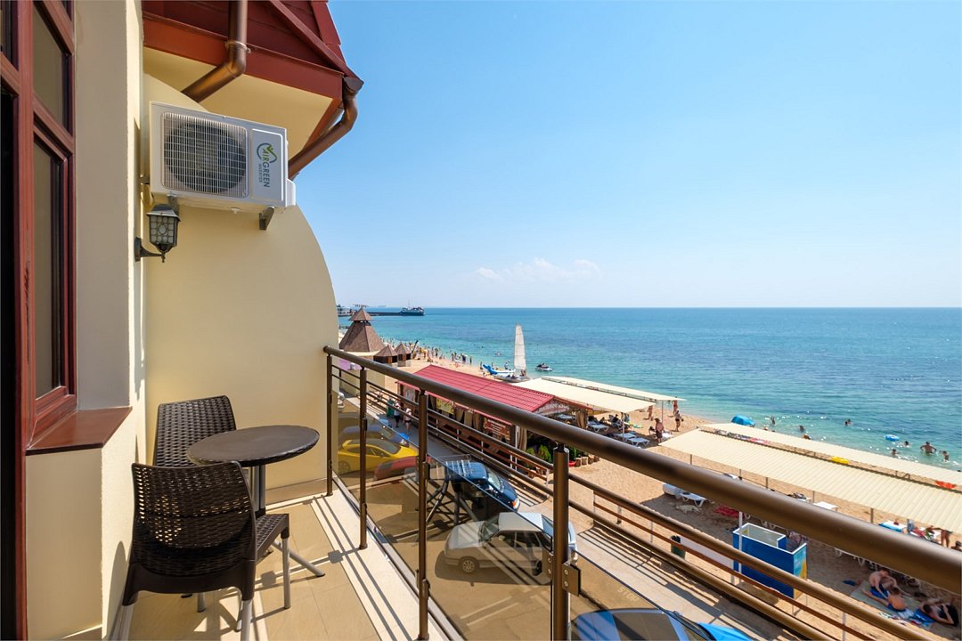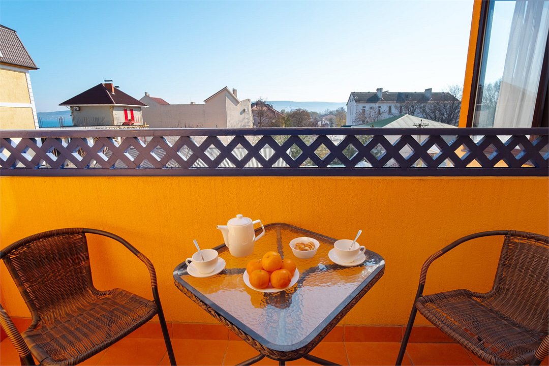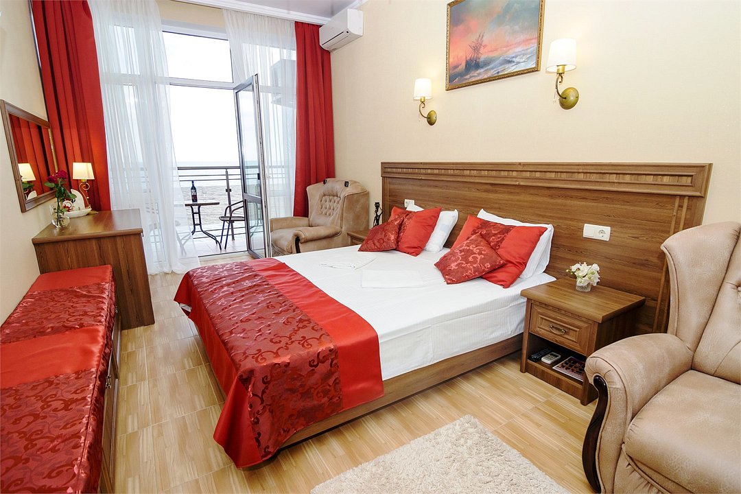 В номере: - Кровать (двуспальная или две односпальные) - Дополнительное место (раскладушка) - Кондиционер - Сигнализация - Звукоизоляция - Сейф - Шкаф-купе - Стол письменный и стул - Прикроватные тумбочки Кухонная зона: - Холодильник - Электрочайник - Посуда (минимальный набор) - Микроволновая печь (по запросу) - Питьевая вода в номере Санузел: - Душ - Туалет - Умывальник - Полотенца (банные и пляжные) - Мини-парфюмерия - Фен Услуги: - Частота уборки (1 раз в 3 дня или по требованию) - Смена постельного белья (1 раз в 3 дня или по требованию) Дополнительно - Балкон - Пол: плиточный (с подогревом) - Москитная сетка, плотные шторы - Вид из номера: на море Технологии: - Телевизор (плазменный, кабельное ТВ) - Доступ в Интернет Wi-FiУслуги и удобства