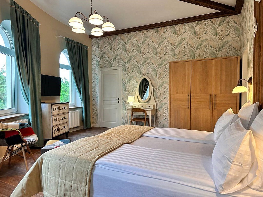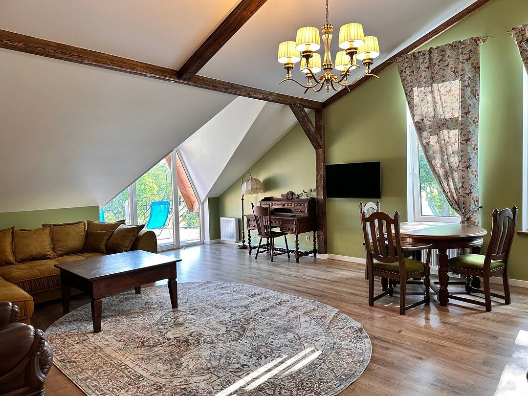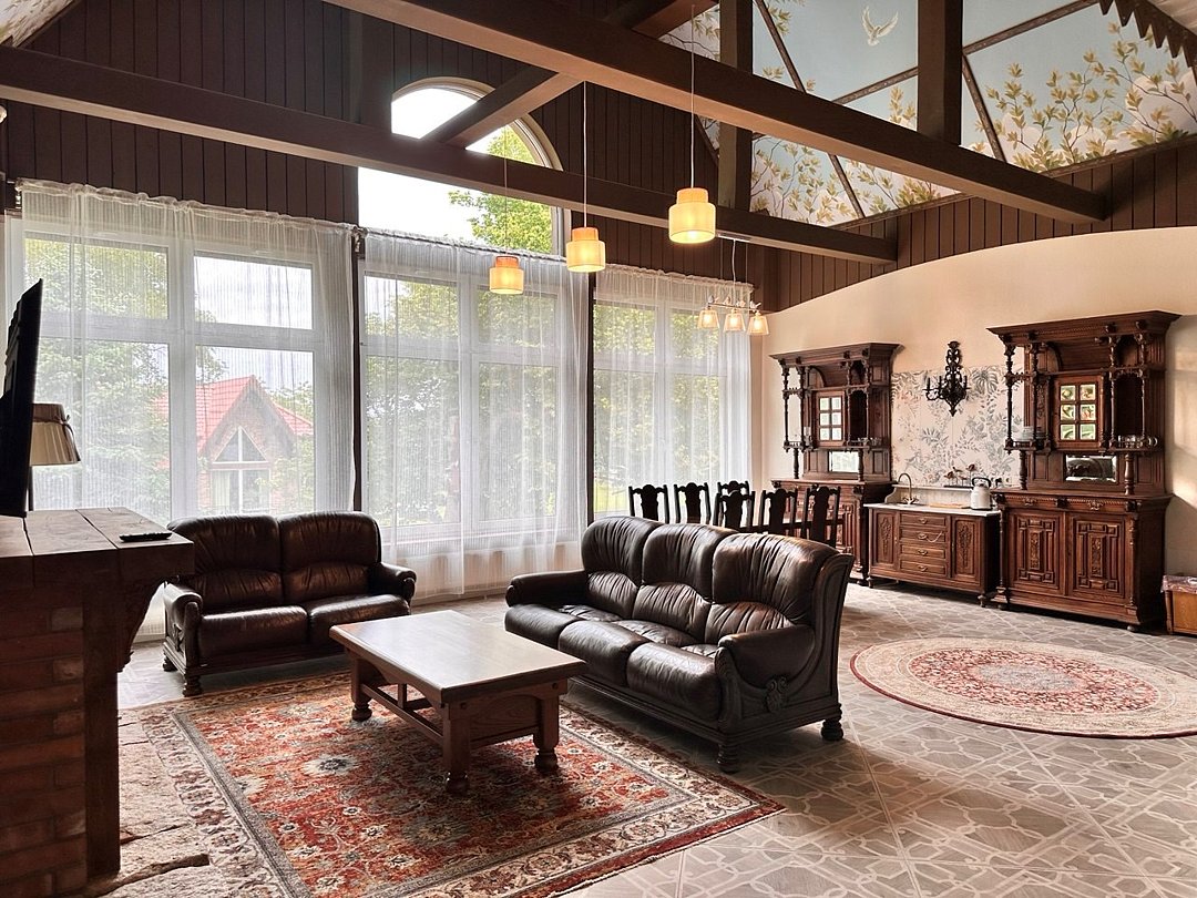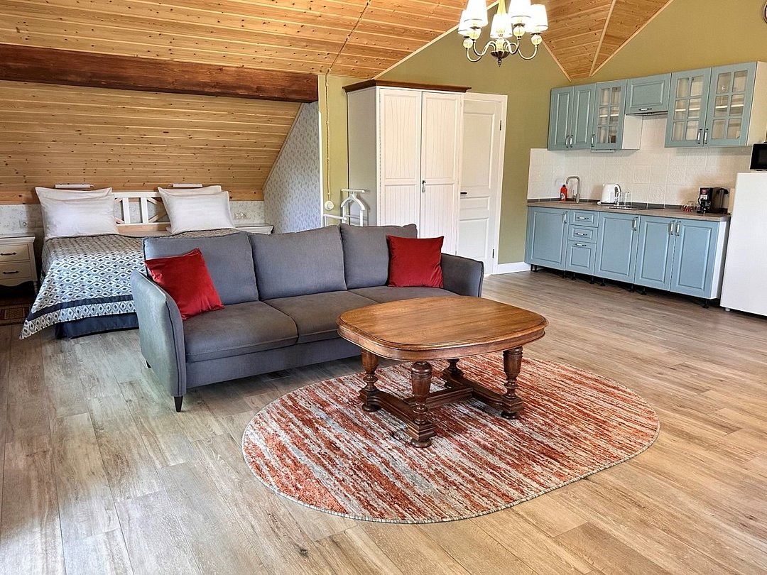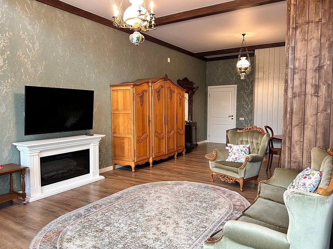 Три номера на втором этаже корпуса "терем" с одной общей лаундж зоной, оснащенной обеденной зоной, кухней, телевизором и камином.Услуги и удобства