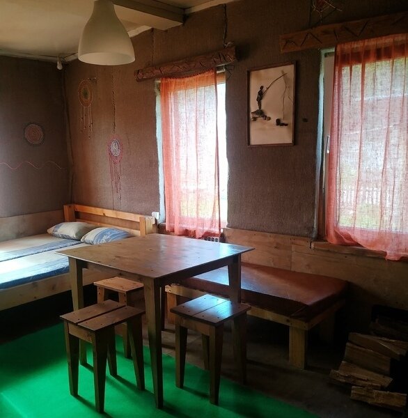 Уютный 2-х местный домик деревенского типа. В домике имеется: 2 двуспальные кровати, печь, диван, стол и табуреты из дуба (ручной работы).