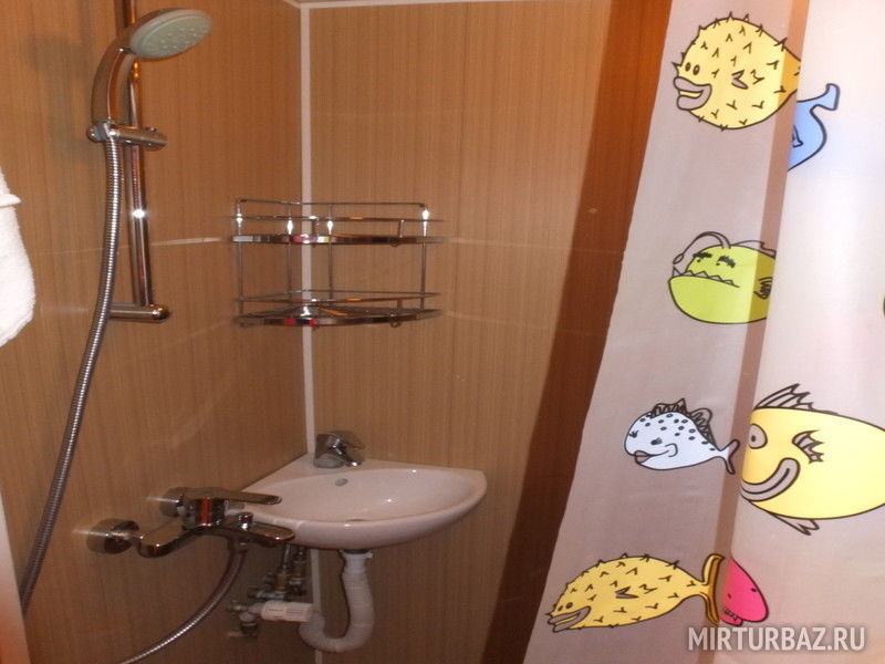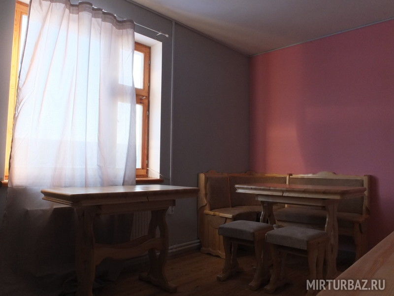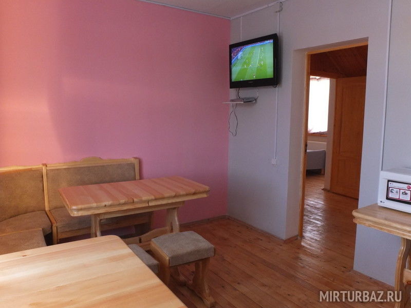 1-этаж: холл, санузел, кухня-столовая (стенка, плита, холодильник, посуда, ТВ), 2 номера с двуспальными кроватями, 2 номера с односпальной и двуспальной кроватью.