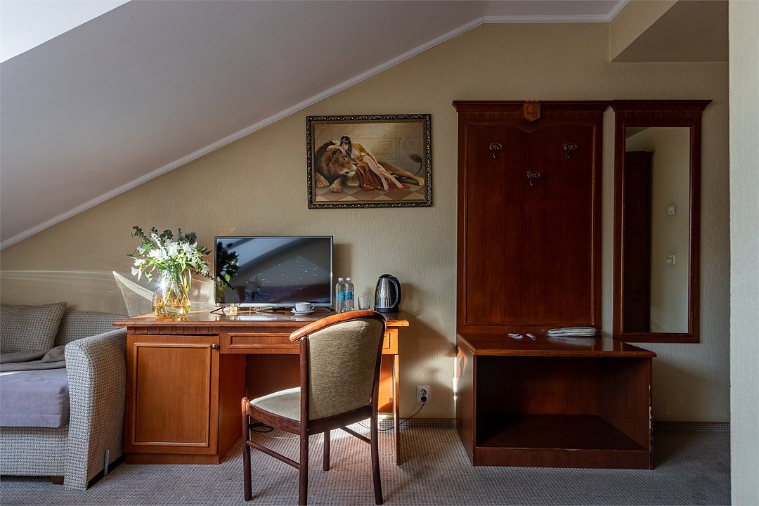 телевизор, кабельное телевидение, Wi-Fi, кондиционер, светильник, настольные лампы, фен, ванная комната, ванна, халаты, банные полотенца, тапочки, гигиенические средства, косметические средства, двуспальная кровать, две односпальные кровати, диван, тумбы, стулья, шкаф для одежды, вешалки, журнальный столик, письменный стол, зеркало, мебельный гарнитур, чайный набор, обслуживание номеров, чайник, унитаз, раковина, косметическое зеркало, питьевая вода, отопление, кулер на этаже, стаканы, стул, тумба, туалетные средства, туалет, телевизор с плоским экраном, мини-холодильник, москитная сетка, мансардные окна, номер для некурящих, рабочий стол, уборка номера, набор для приготовления чая и кофе, мыло, затемняющая штора, зеркало в полный рост, можно с питомцамиВ гостиничном номере