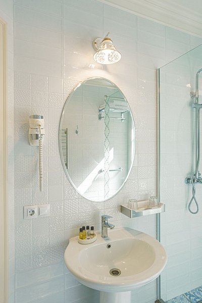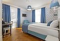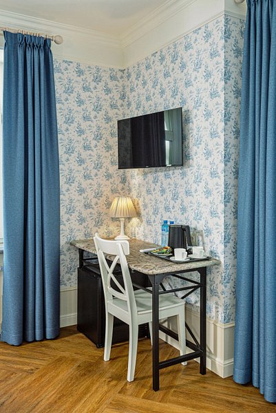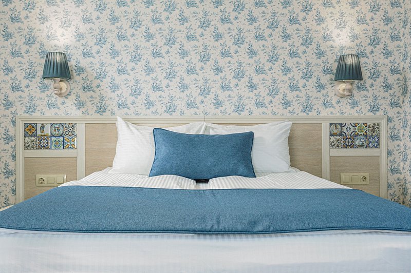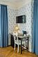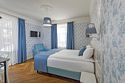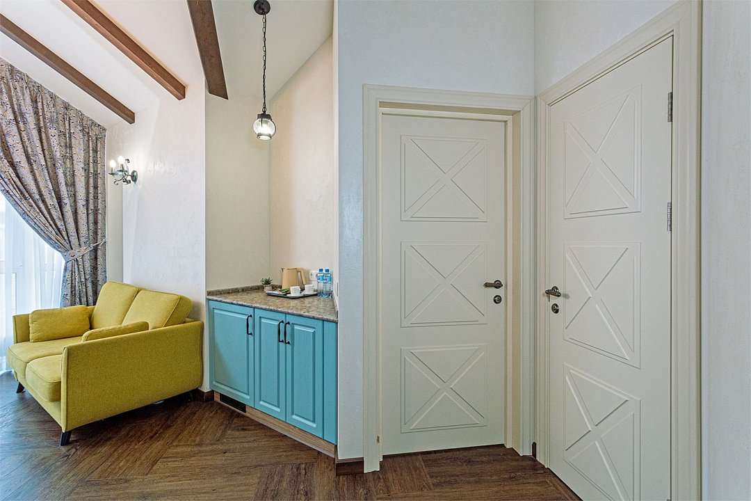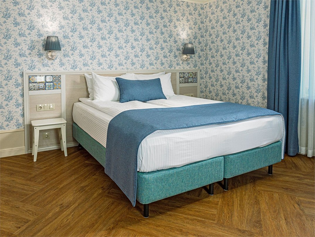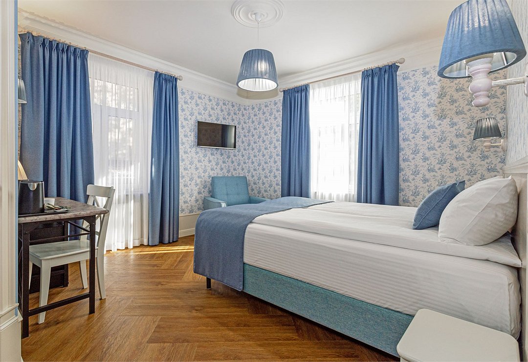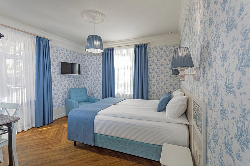 Уютный номер в небесных тонах с новым, современным дизайном в стиле "Прованс". Номер обустроен всеми удобствами для комфортабельного отдыха: шторами, не пропускающими дневной свет "блэкаут", кондиционером , Smart TV, холодильником, чайником, ортопедическим матрасом средней жесткости, сатиновым постельным бельем, мягкими махровыми полотенцами, плотными мягкими одноразовыми тапочками, зубным набором, шапочкой для душа, расческой, гелем для душа, шампунем, мылом, холодильником, чайником, чайным набором с тремя сортами чая, кофе, сахаром, стаканами, бутилированной водой. Так же номер оснащен просторным санузлом с окном.Услуги и удобства