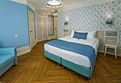 Уютный номер в рубиновых или бирюзовых тонах с новым, современным авторским ремонтом. Номер обустроен всеми удобствами для комфортабельного отдыха.