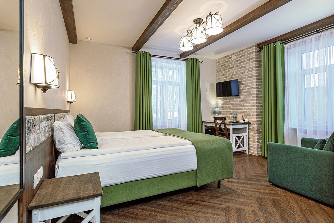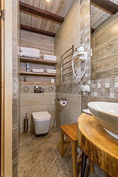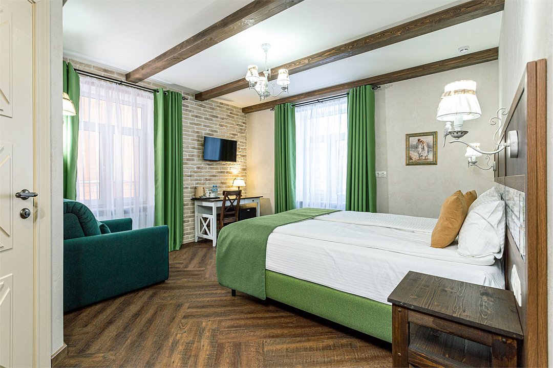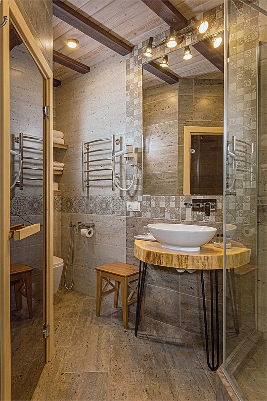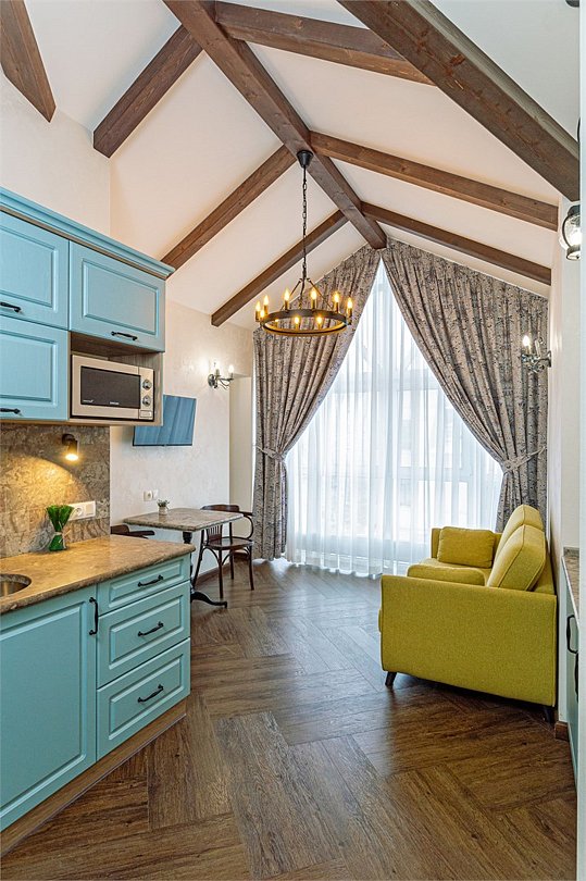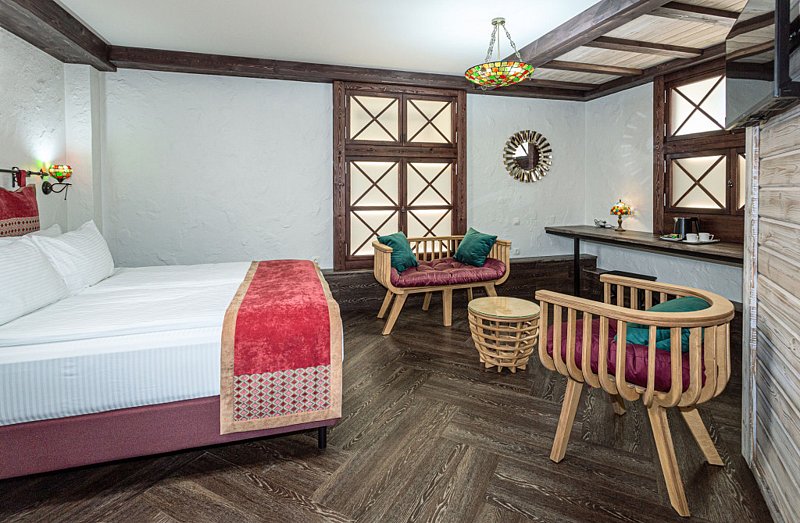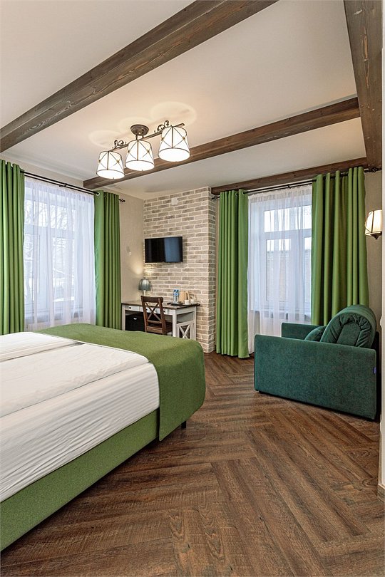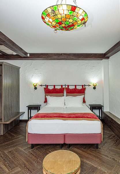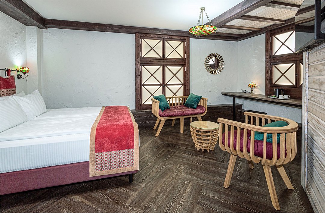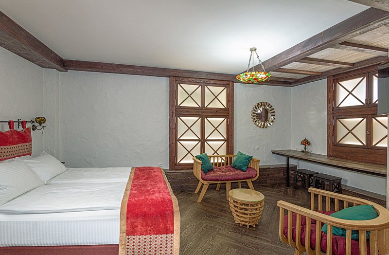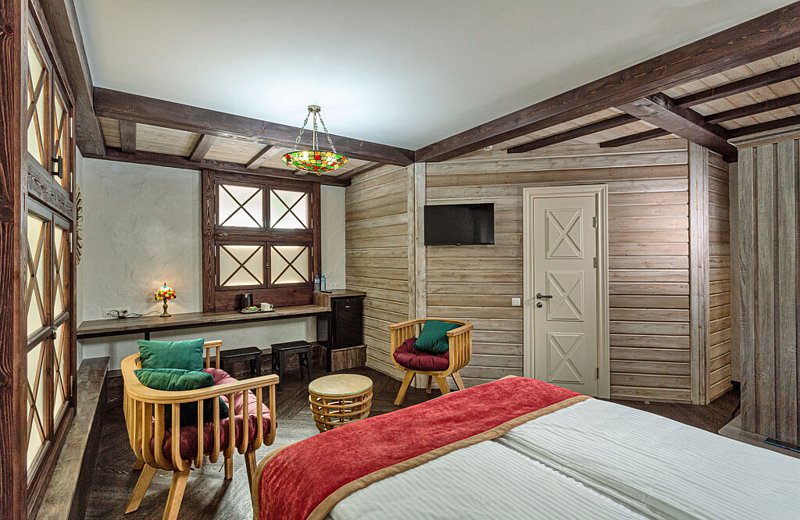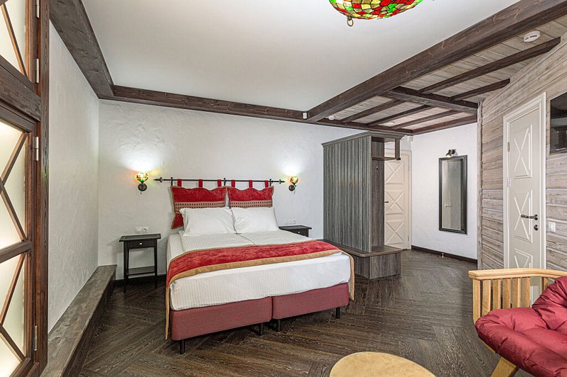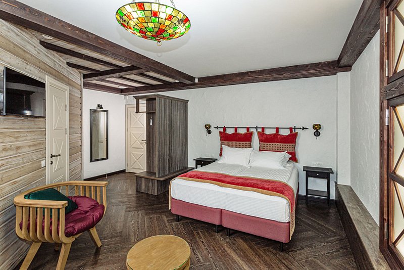 Уютный номер в "Рустикальном" стиле, с собственной сауной и просторной зоной отдыха. Идеальный номер для комфортного размещения! В номере площадью 36 м² свободно разместятся до 3 гостей . В номере есть все необходимое: удобная большая кровать "queen-size" с ортопедическим матрасом, просторный стол, телевизор со smart TV, уютная зона отдыха, современная ванная комната и собственная сауна. Рустикальный номер отличается особой атмосферой благодаря использованию натуральных материалов, таких как дерево, камень и текстиль с грубой фактурой. Массивные балки и своды из натурального дерева напоминают средневековые деревенские мотивы и придают особую атмосферность данному номеру. Номер в "Рустикальном" стиле находится на цокольном этаже и имеет 2 скошенных окна. Услуга "сауна" оплачивается отдельно от стоимости проживания по Вашему желанию.Услуги и удобства