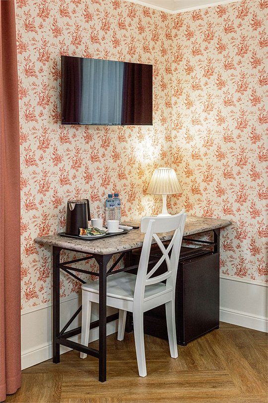 Wi-Fi, кондиционер, настольные лампы, фен, душевая кабина, санузел, банные полотенца, две односпальные или большая двуспальная кровать, шкаф для одежды, письменный стол, чайник, вид на город, вид во двор, стаканы, стул, раскладное кресло, мини-холодильник, гостиничная парфюмерия, телевизор со Smart TV, гигиенический душ, кресло-кровать, уборка номера, набор для приготовления чая и кофе, вешалки-плечики, бутилированная вода, шапочка для душа, дождевой и ручной душВ номере