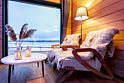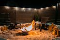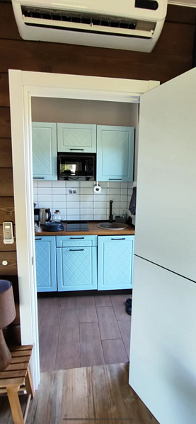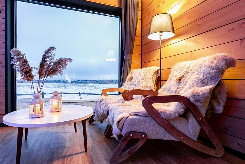 Дом 36 кв. м. имеет собственный участок, личное джакузи в террасе, костровую зону с креслами, обеденный стол c барбекю, гамак и панорамные окна с живописным видом.