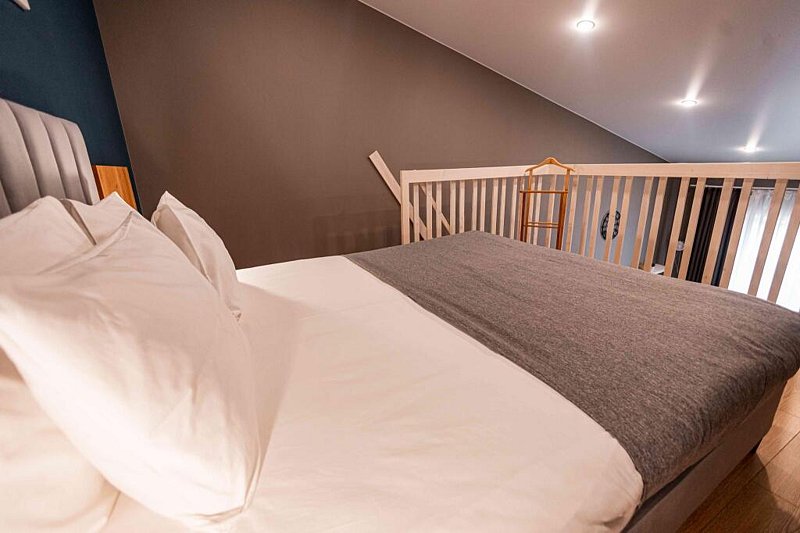 Только в апартаменте «Люкс» есть кресло-кровать, которое может быть использовано как дополнительное место. На первом этаже расположены кухня и зона отдыха, а на втором этаже – уютная спальня.