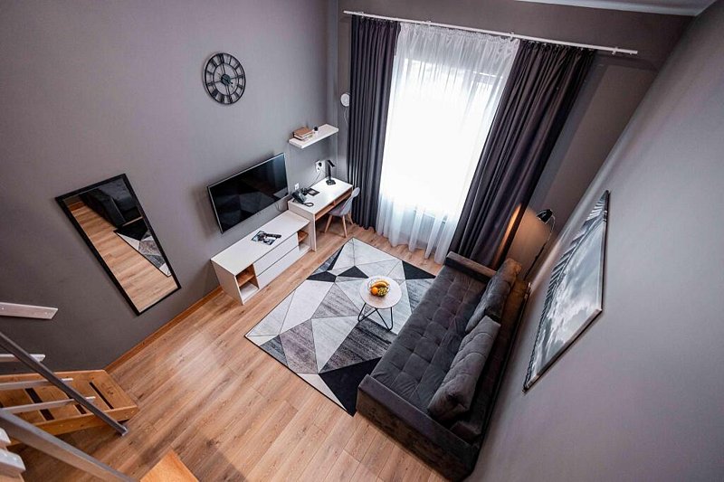 Только в апартаменте «Люкс» есть кресло-кровать, которое может быть использовано, как дополнительное место. На первом этаже расположены кухня и зона отдыха, а на втором этаже – уютная спальня.