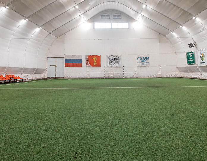 Крытое футбольное поле 20х40 метров с качественным газоном высотой 4 см, 2 комплекта ворот 3 х 2 метра, профессиональное освещение, комфортные душевые и раздевалки, большие трибуны для зрителей.