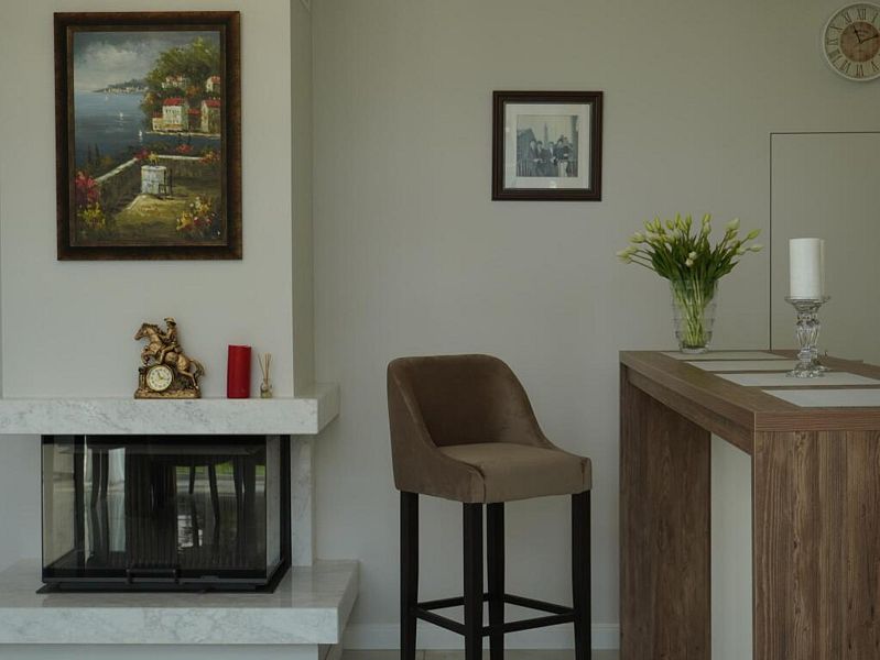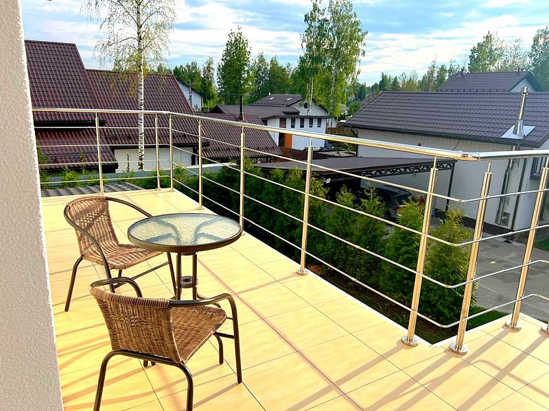 На первом этаже дома к услугам гостей просторная гостиная с мягкой зоной отдыха и большим телевизором, камином, столовая с панорамными окнами и террасой. На втором этаже уютная библиотека с выходом на видовой балкон.
