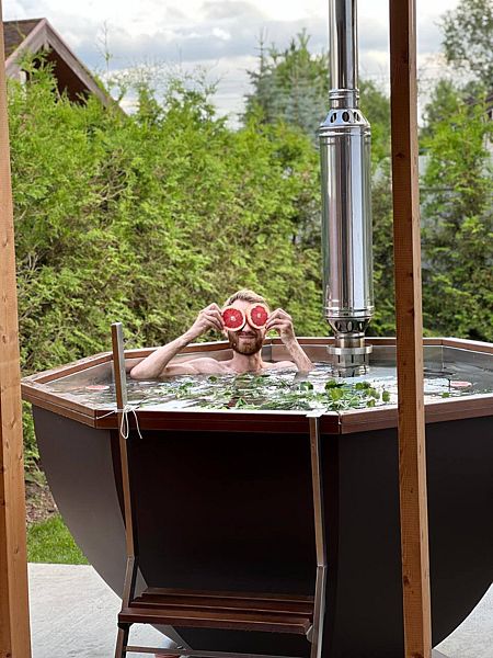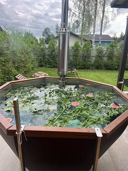 Позвольте себе насладиться расслабляющим спа-отдыхом на свежем воздухе в банном чане. Температура поддерживается на комфортном уровне, что способствует полному расслаблению. В воду добавляются натуральные травы и фрукты, что делает каждое погружение не только приятным, но и полезным для здоровья.