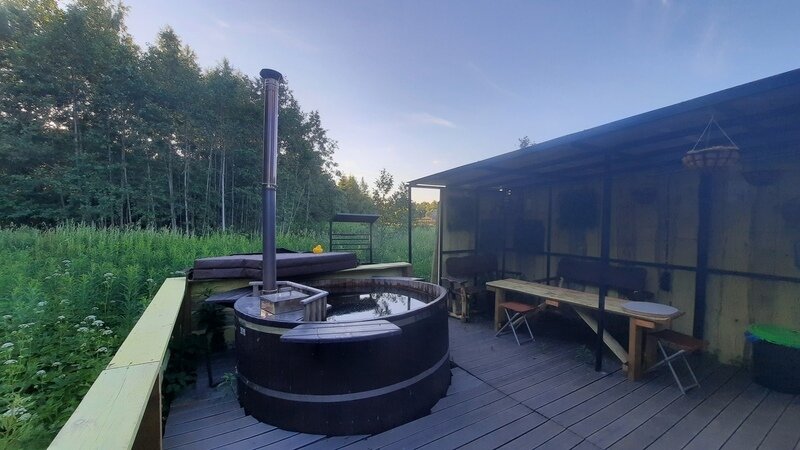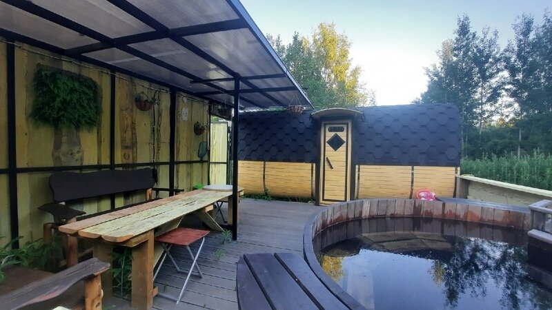 Читать полностьюРядом с баней имеется купель. Баня с горячей купелью — 7000 ₽ / 3 часа. В стоимость входит: санузел, мангальная зона с террасой.