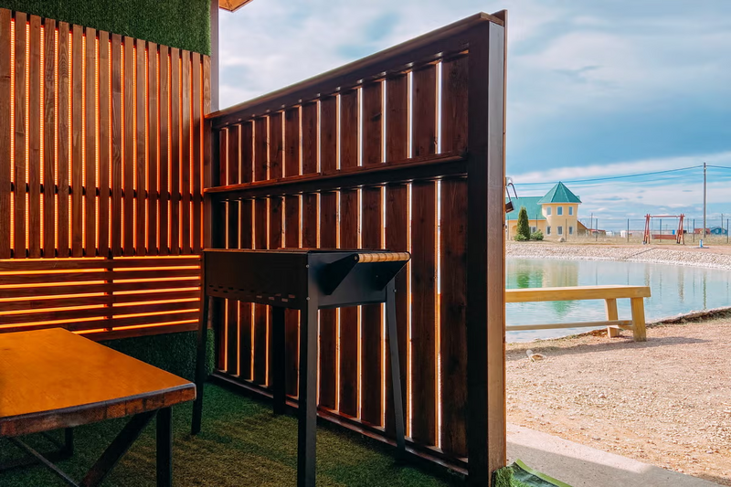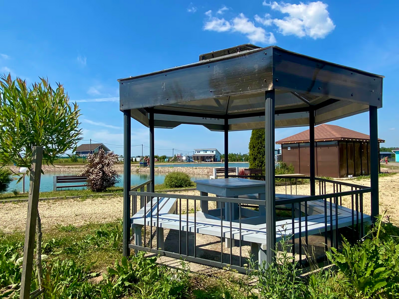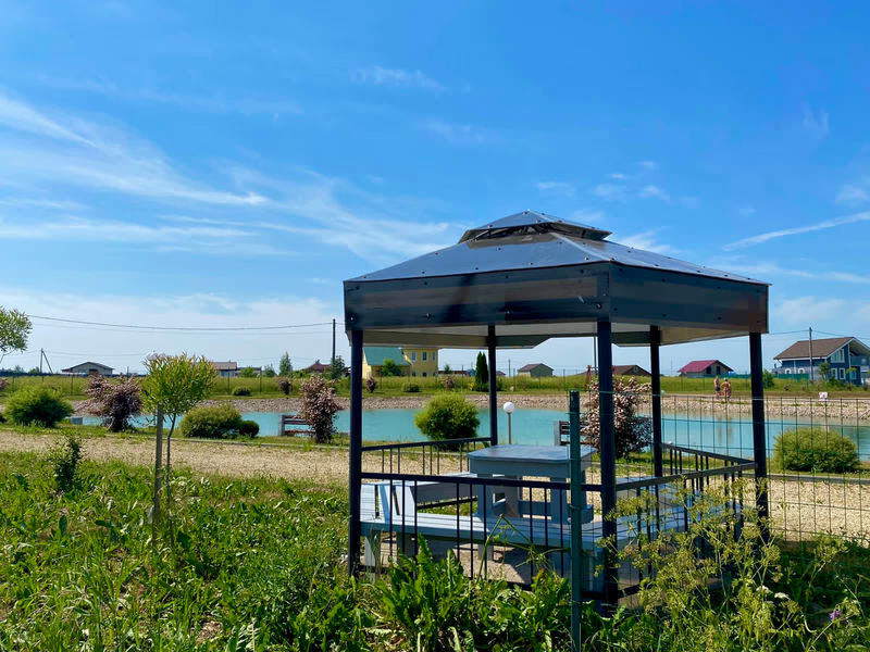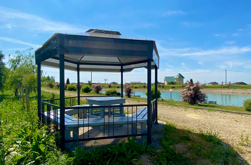 Горячая купель находится в закрытой беседке на берегу водоема, мангал решетка и шампура входят в стоимость. В купель с легкостью вмещаются 4–6 взрослых человека, также рядом оборудована полноценная территория для семейного отдыха: