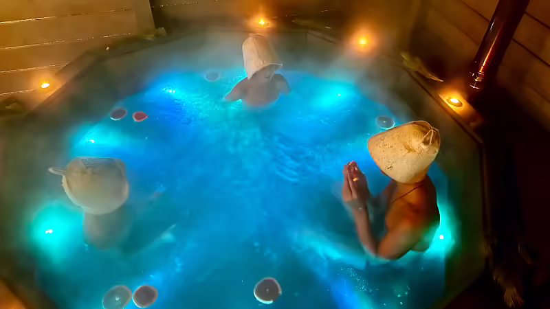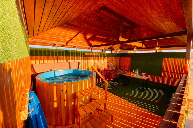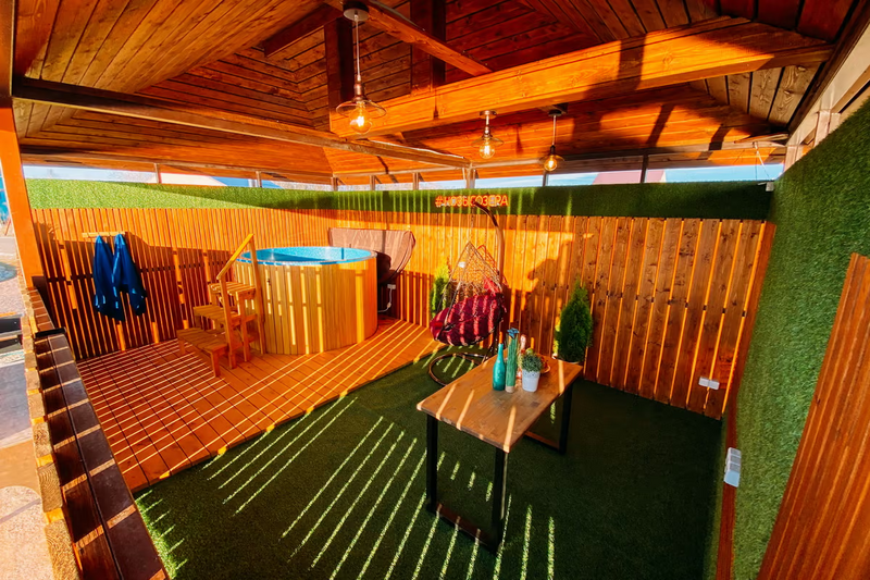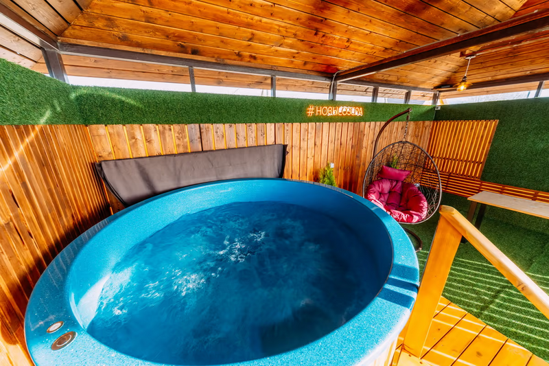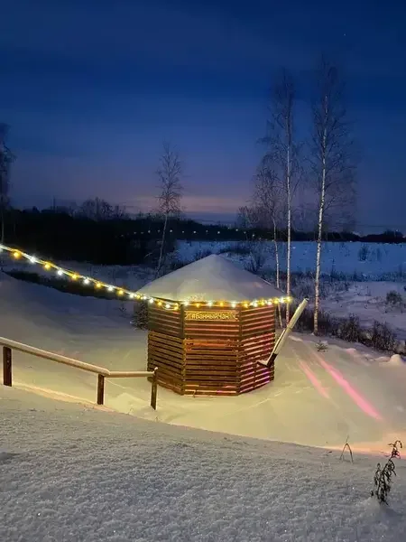 Читать полностьюГорячая купель находится в закрытой беседке на берегу водоема, мангал решетка и шампура входят в стоимость. В купель с легкостью вмещаются 4–6 взрослых человека, также рядом оборудована полноценная территория для семейного отдыха: