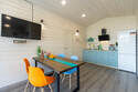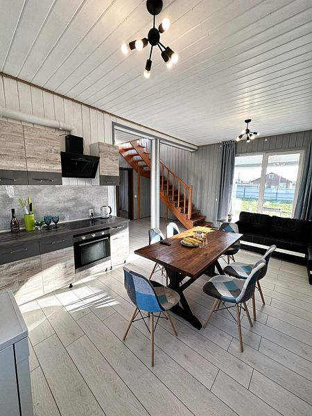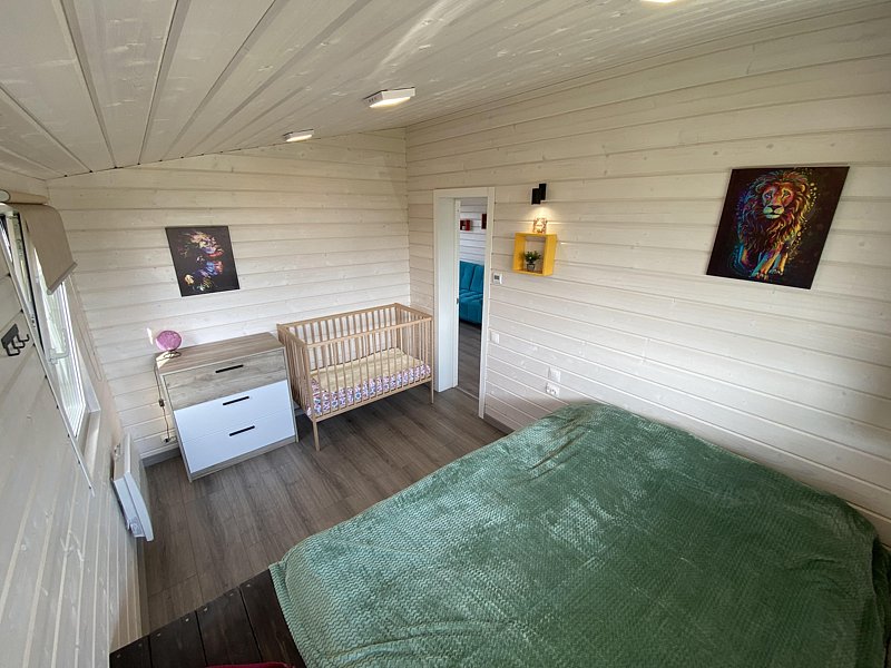Кухня-гостиная, оснащенная всей техникой и посудой (тв, посудомойка, холодильник, варочная панель, микроволновая печь). 1 отдельная спальня с двуспальной кроватью 160/200, детская кроватка предоставляется бесплатно. В кухне-гостиной двуспальный диван. Туалет и душ, во всем коттедже теплые полы.