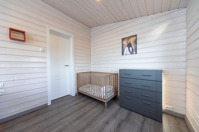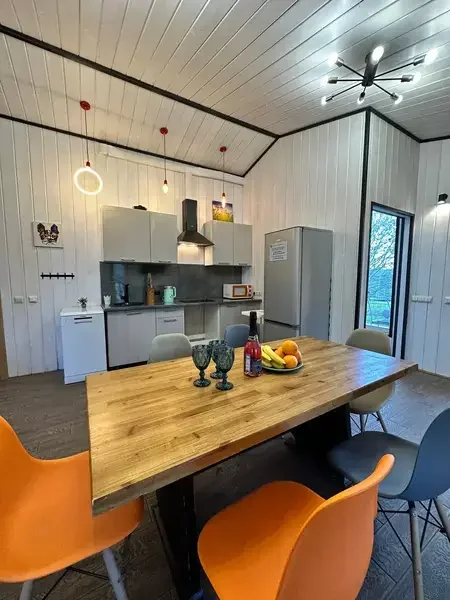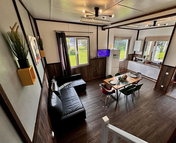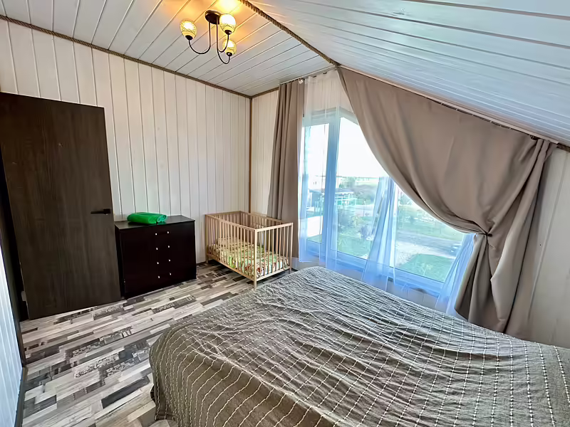 Коттедж общей площадью 110 м2 имеет просторную кухню-гостиную. Три спальни с двуспальными кроватями, детская кроватка предоставляется бесплатно (1 спальня на первом, 2 на втором этаже). В гостиной расположен двуспальный диван. Кухня оборудована всей необходимой техникой: варочная панель, микроволновая печь, холодильник, посудомоечная машина, спутниковое TV. Мангал решетка и шампура входят в стоимость. 2 туалета и просторная душевая. Парная на дровах. Бесплатный Wi-Fi
