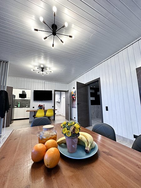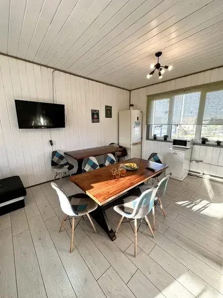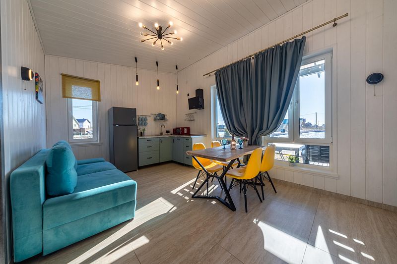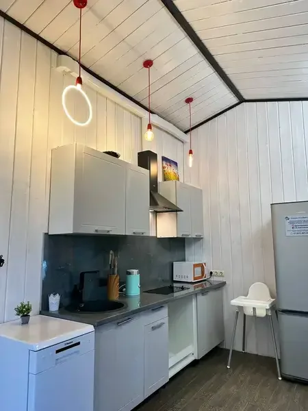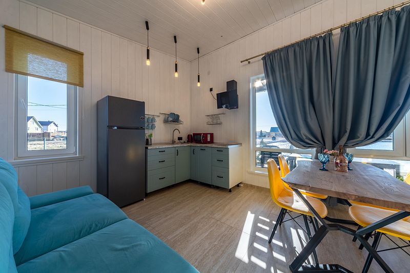 Кухня-гостиная, оснащенная всей техникой и посудой (тв, посудомойка, холодильник, варочная панель, микроволновая печь). 1 отдельная спальня с двуспальной кроватью 160/200, детская кроватка предоставляется бесплатно. Кухня-Гостиная двуспальный диван. Бесплатный Wi-Fi. Туалет и просторная душевая с теплыми полами. Большая крытая терраса с подвесным креслом. Мангальная зона, мангал, решетка и шампура предоставляется бесплатно. Возможно проживание с домашними питомцами.