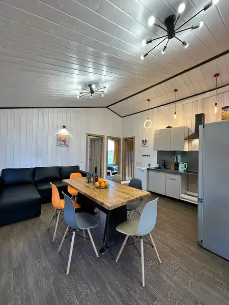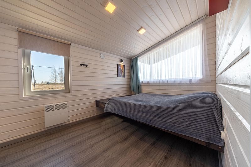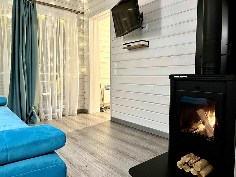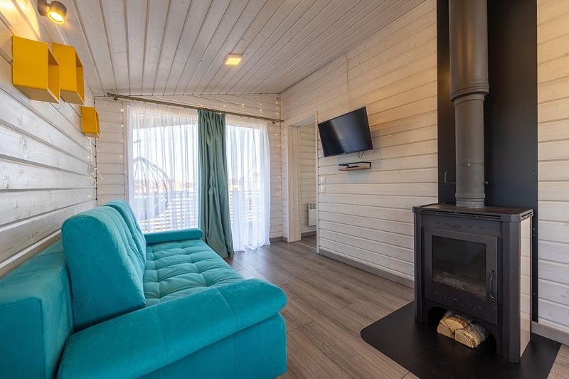 Коттедж общей площадью 39 м2 имеет просторную кухню-гостиную с камином. Одна спальня с двуспальной кроватью. В гостиной расположен двуспальный диван. Мангал решетка и шампура входят в стоимость. Комфортный сан. узел и душевая с теплым полом. Бесплатный WI-FI.