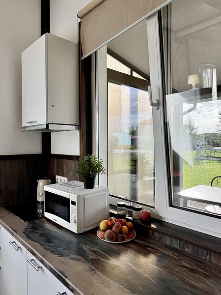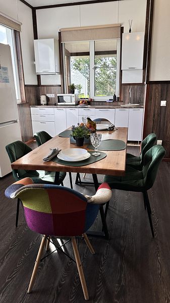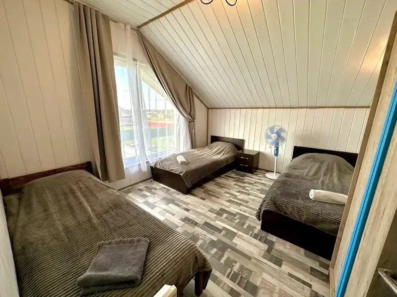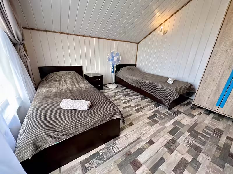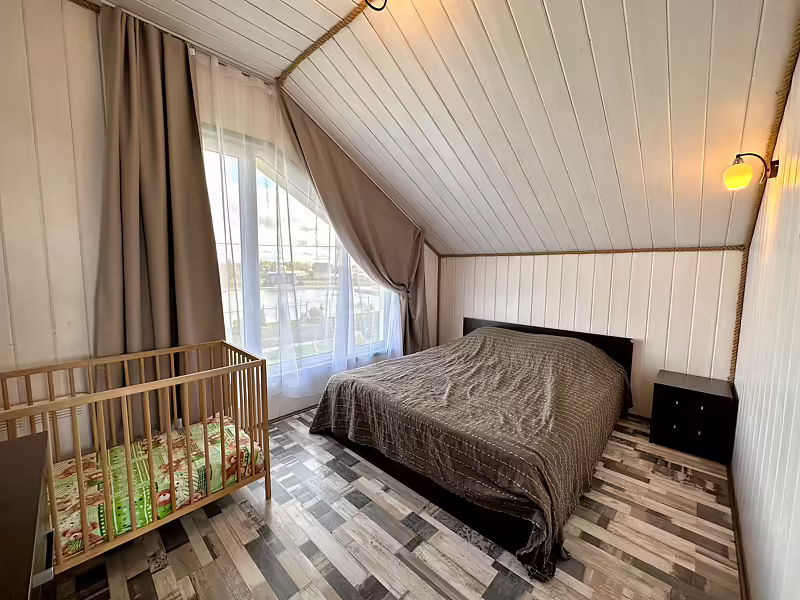 Коттедж имеет просторную кухню-гостиную. Две спальни с двуспальной кроватью, детская кроватка предоставляется бесплатно. Одна спальня с двух ярусной кроватью и односпальной. В гостиной расположен двуспальный диван. Мангал решетка и шампура входят в стоимость. Туалет и комфортный душ. Бесплатный Wi-Fi. Во всем коттедже теплые полы. Кухня оборудована всей необходимой техникой: микроволновая печь, холодильник, посудомоечная машина, спутниковое TV.