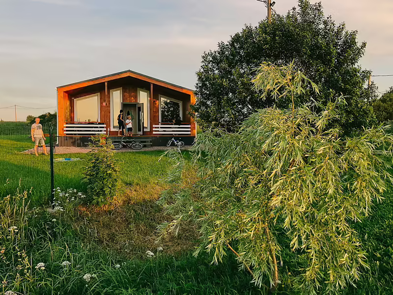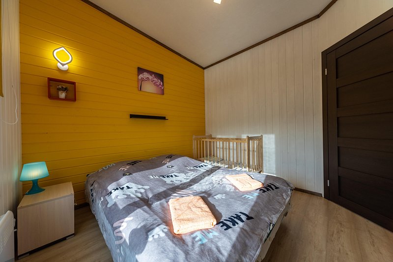 Коттедж общей площадью 49 м2 имеет просторную кухню-гостиную. Две спальни с двуспальной кроватью, детская кроватка предоставляется бесплатно. В гостиной расположен двуспальный диван. Мангал решетка и шампура входят в стоимость. Туалет и комфортный душ. Бесплатный Wi-Fi