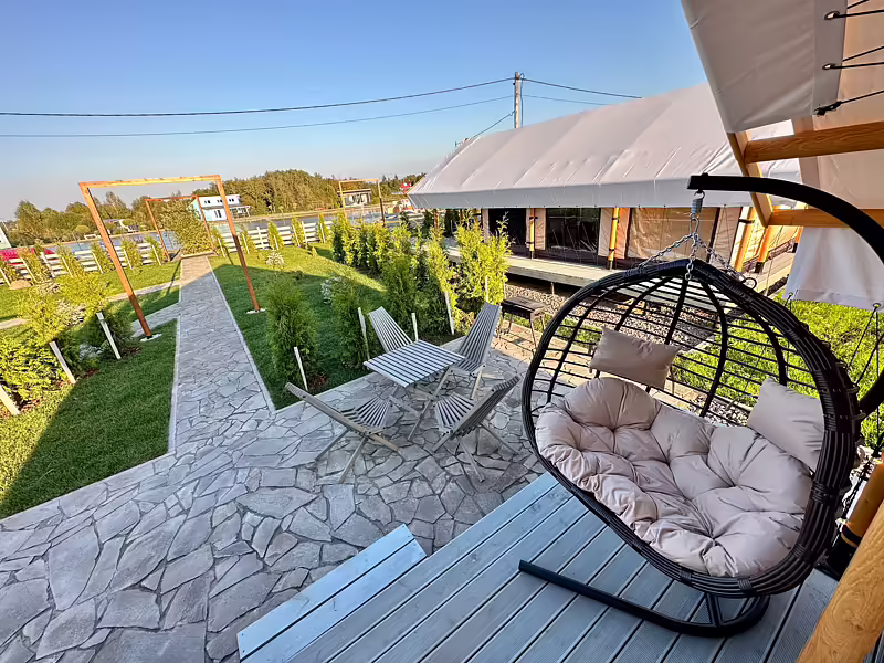 Теплый и уютный Глэмпинг Лодж с панорамным видом, большой террасой, подвесным креслом и красивым видом. Лодж это палатка с комфортом гостиничного номера, для круглогодичного проживания в ней тепло в -30, и прохладно в +30, в Лодже есть кондиционер.