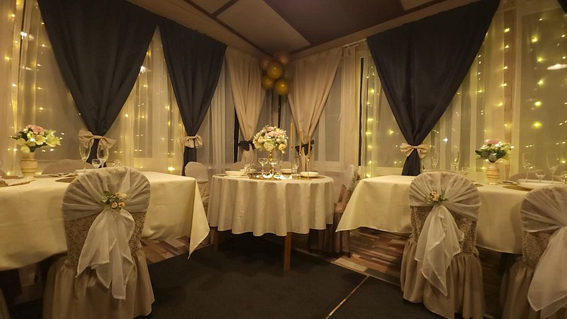 Банный комплекс, купель, банкетная сервировка стола.