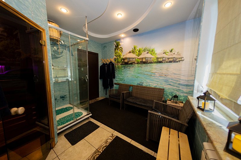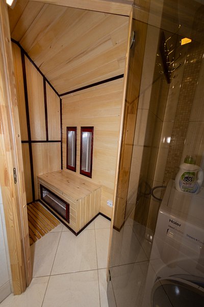Дополнительно имеется банный комплекс, вход и выход из которого осуществляется прямо из дома, что избавляет от необходимости выходить на улицу. Баня представляет собой жаркую русскую парную на берёзовых дровах со встроенными соляными блоками и лечебным можжевельником. В бане можно париться с веником, а обливное ведро оснащено функцией автоматического наполнения.