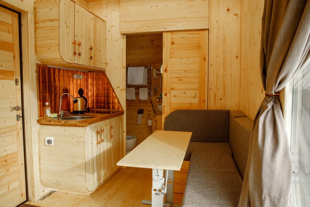 ЭкоДом (технологичная комната с зеркальным панорамным окном) объединена главной характеристикой – они обеспечивают комфорт проживающих, там есть свет, туалет, душ, полноценное место для сна (трансформируется в уютный диван), полностью оборудованная кухня для самостоятельного приготовления пищи.