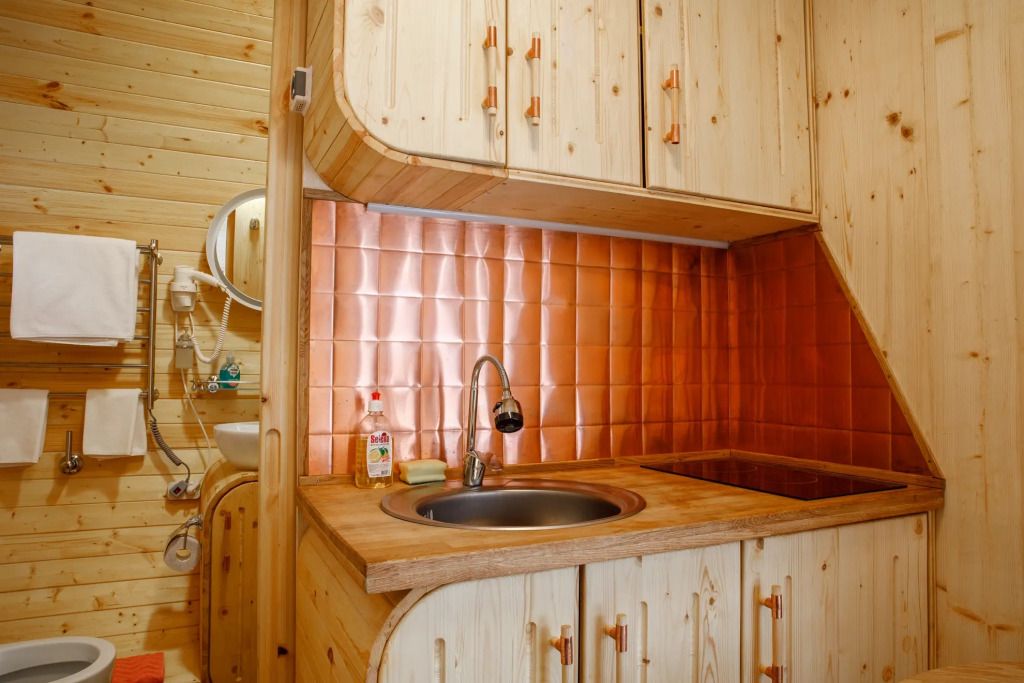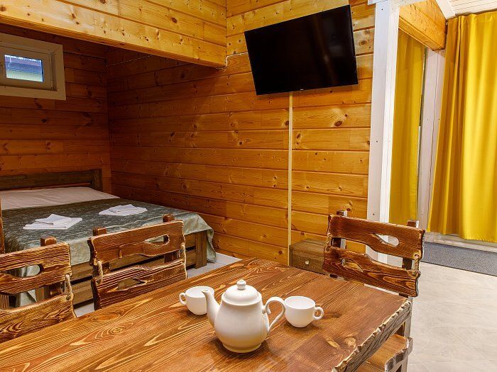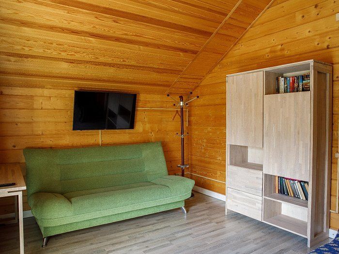 Гостевой домик состоит из 2-х комнат. Холл с угловым диваном (два спальных места), гостиная — студия с двуспальной кроватью и кухней.