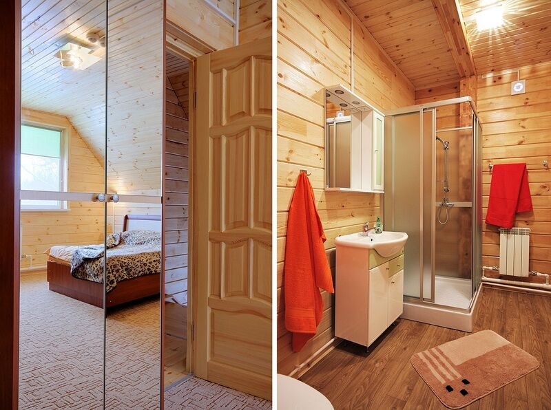 Деревянный дом мансардного типа состоит из 5 комнат: три спальни, гостиная, кухня и 2 -х санузлов. Дома отапливаемые.
