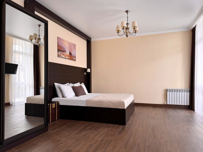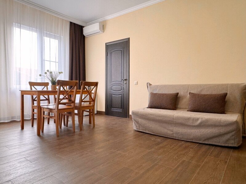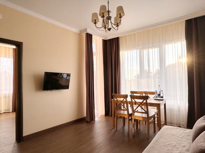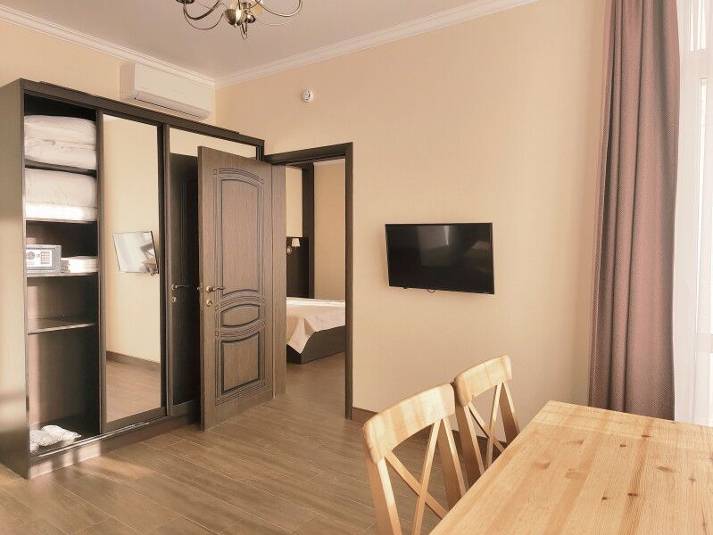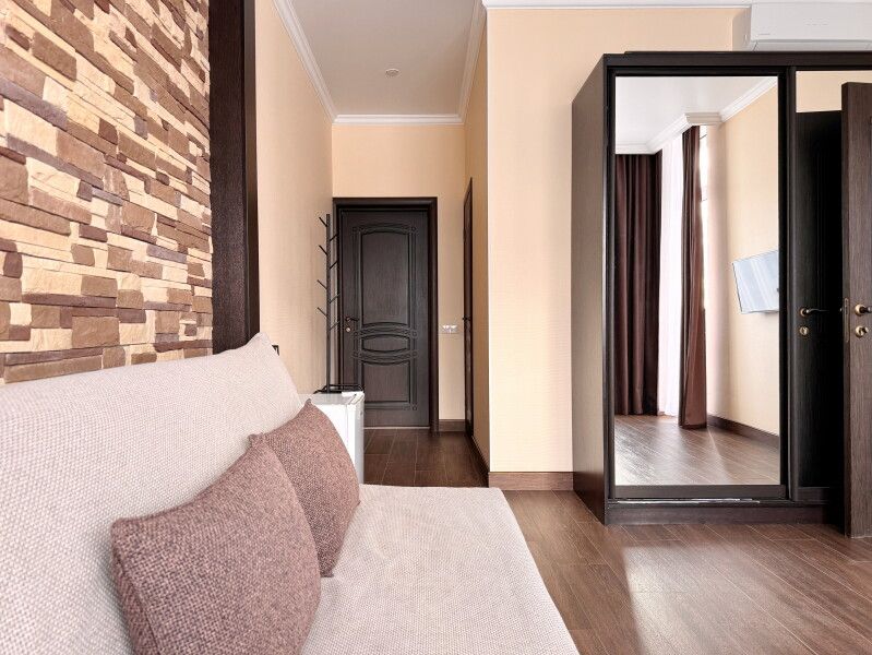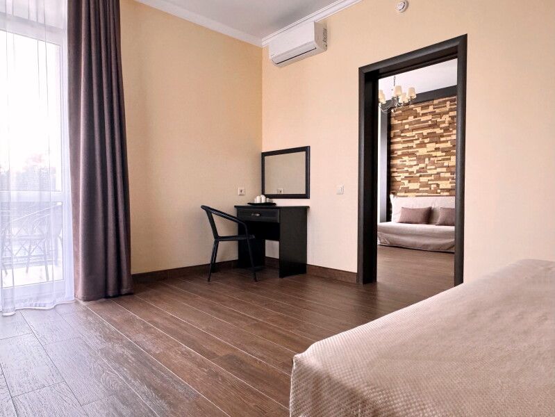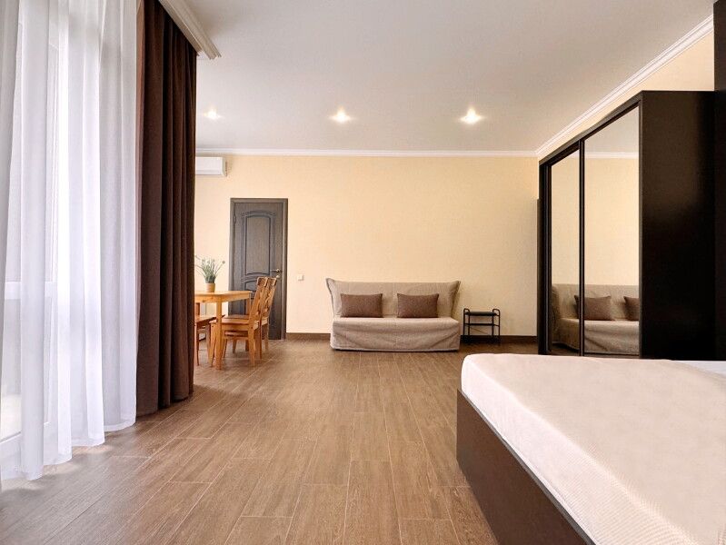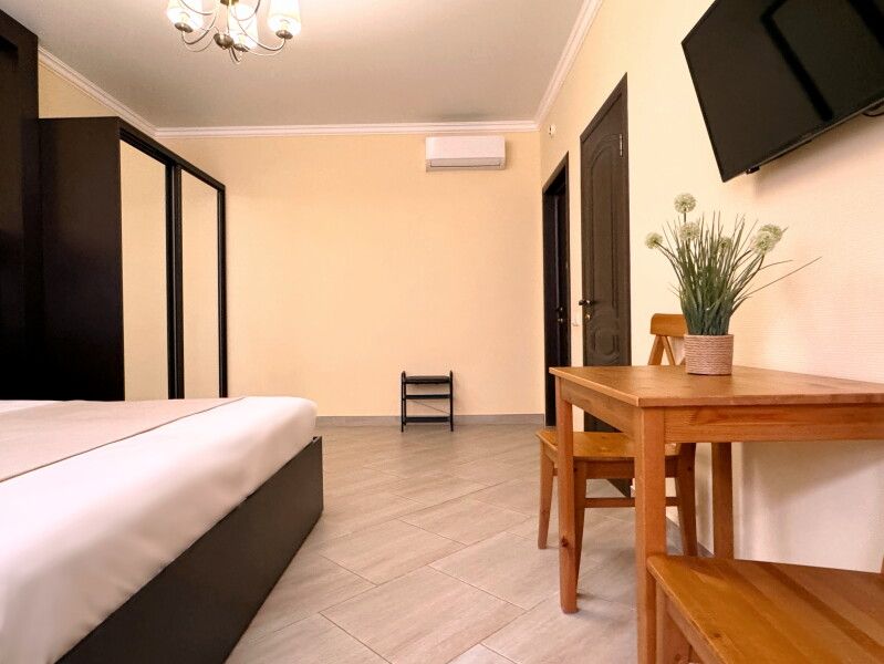 Однокомнатный номер с отдельным входом. Номер оснащен: двуспальная кровать, диван-кровать (140х190), прикроватные тумбочки, шкаф-купе, обеденная группа, ТВ, кондиционер, сейф, мини-холодильник, бутилированная вода, чайная станция.