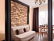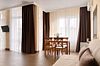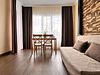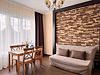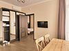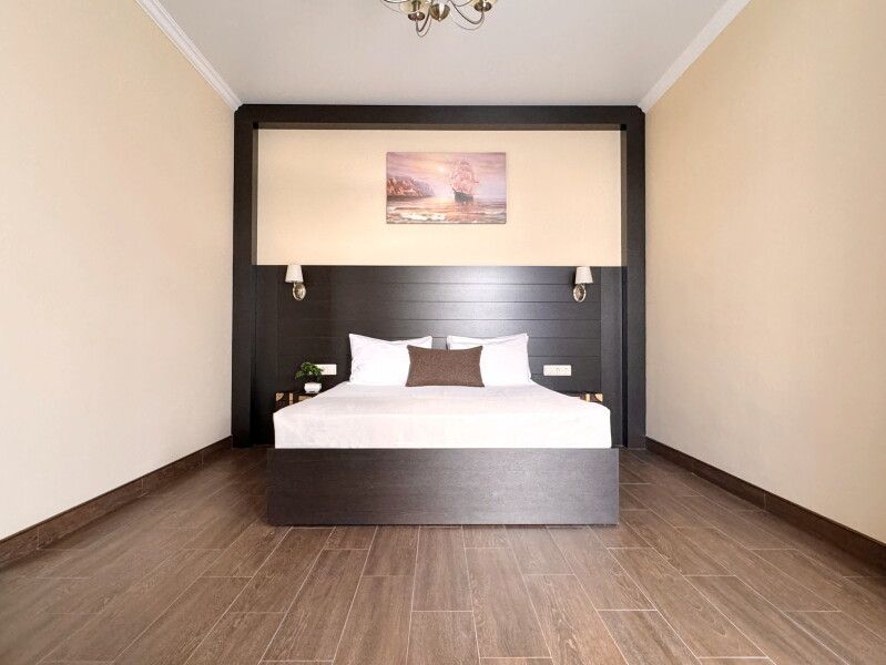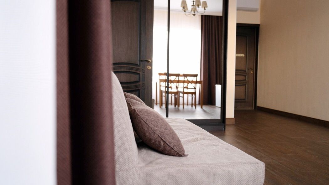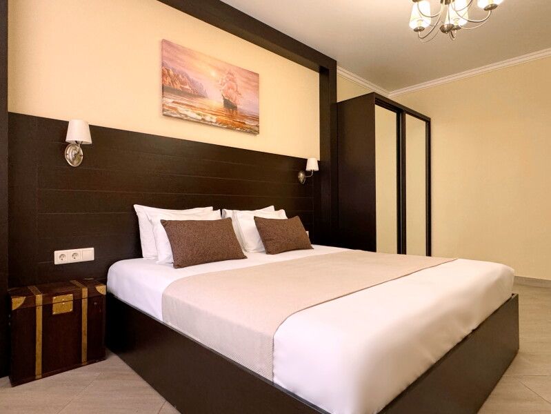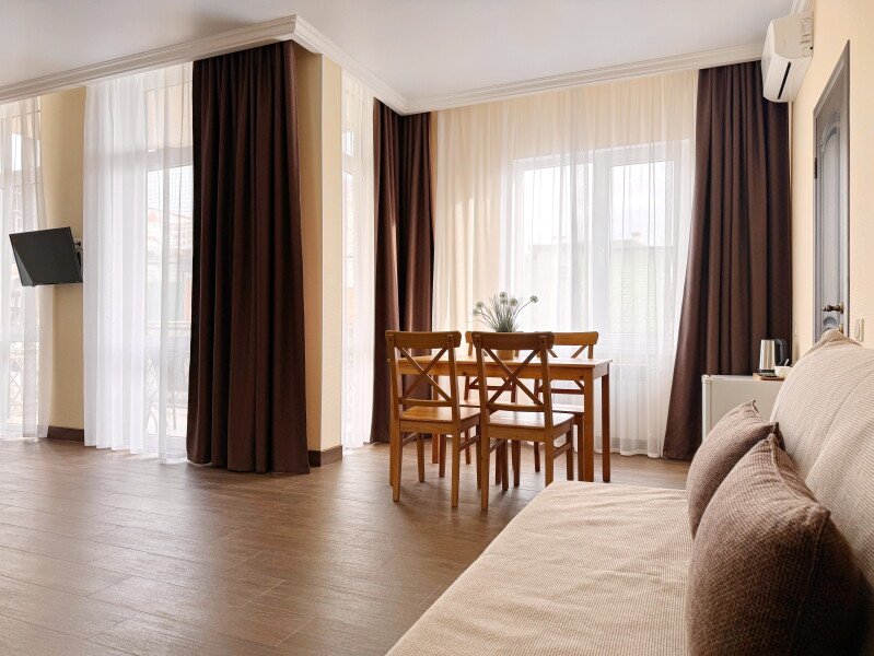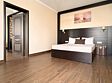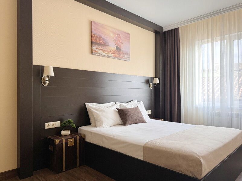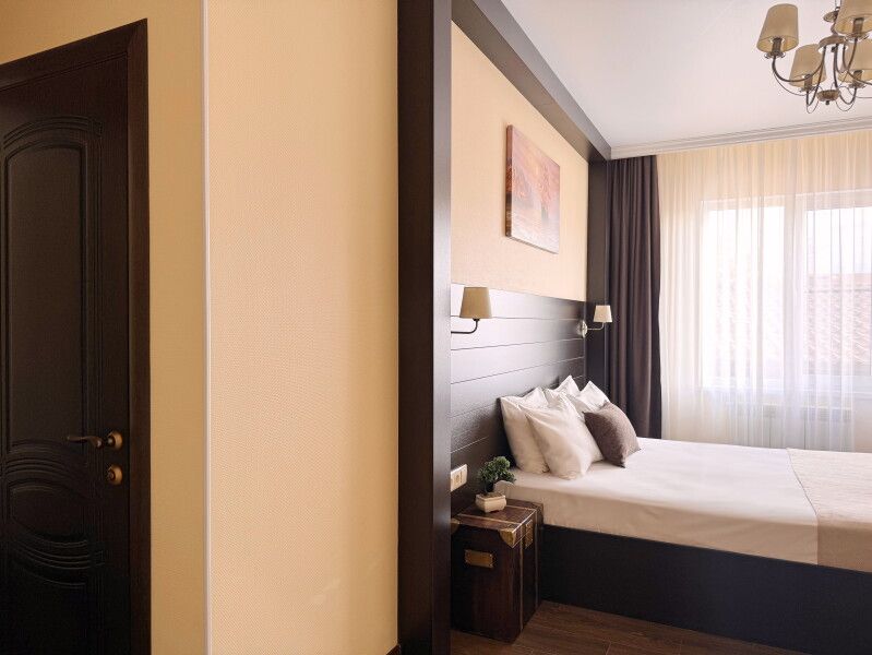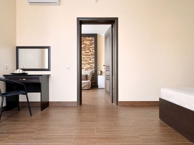 Однокомнатный номер с отдельным входом. Номер оснащен: двуспальная кровать, диван-кровать (140х190), прикроватные тумбочки, шкаф-купе, обеденная группа, ТВ, кондиционер, сейф, мини-холодильник, бутилированная вода, чайная станция.