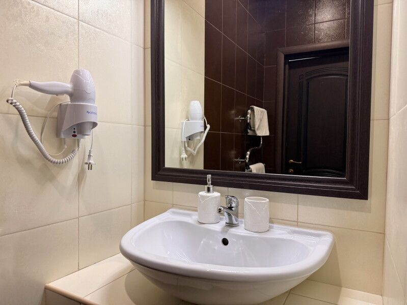 Ванная комната: душ, раковина, туалет, фен, полотенца, гигиенические средства, халат, тапочки.