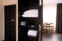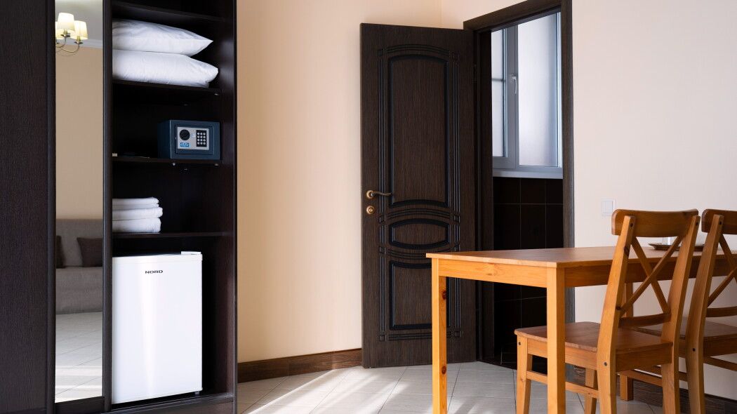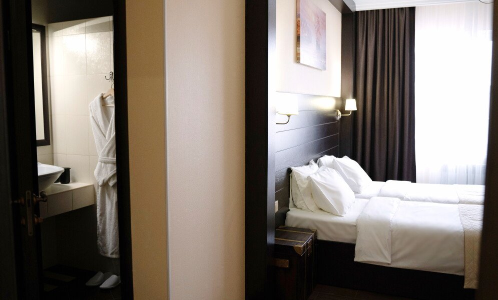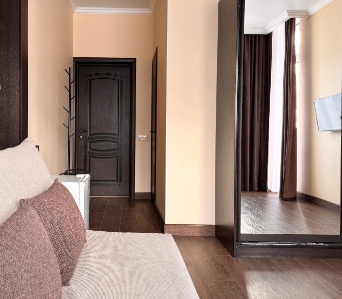 Однокомнатный номер без балкона. Номер оснащен: двуспальная кровать или две односпальные кровати, прикроватные тумбочки, шкаф-купе, стол, стулья, вешалка, обувница, ТВ, кондиционер, сейф, мини-холодильник, бутилированная вода, чайная станция.