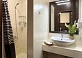 Ванная комната: душ, раковина, туалет, полотенцесушитель, фен, полотенца, гигиенические средства, халат, тапочки.