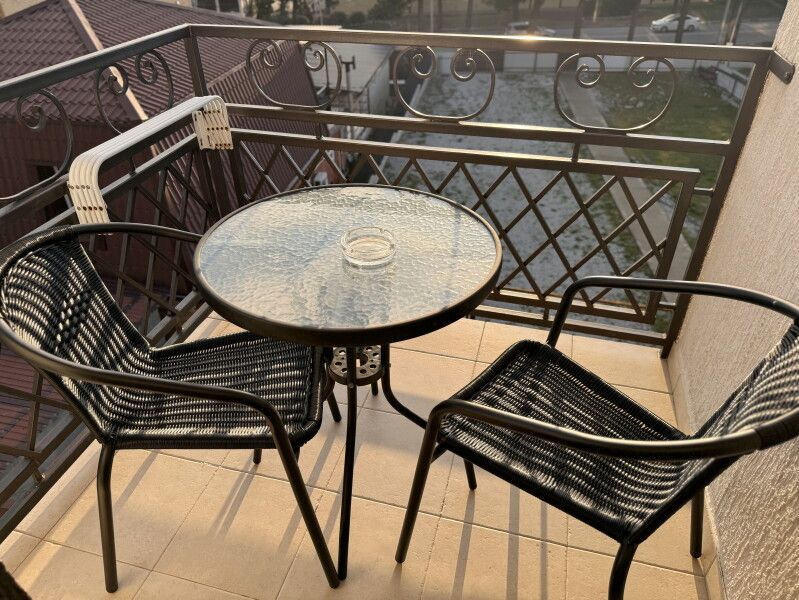 Ванная комната: душ, раковина, туалет, полотенцесушитель, фен, полотенца, гигиенические средства, халат, тапочки. Балкон с видом на море.