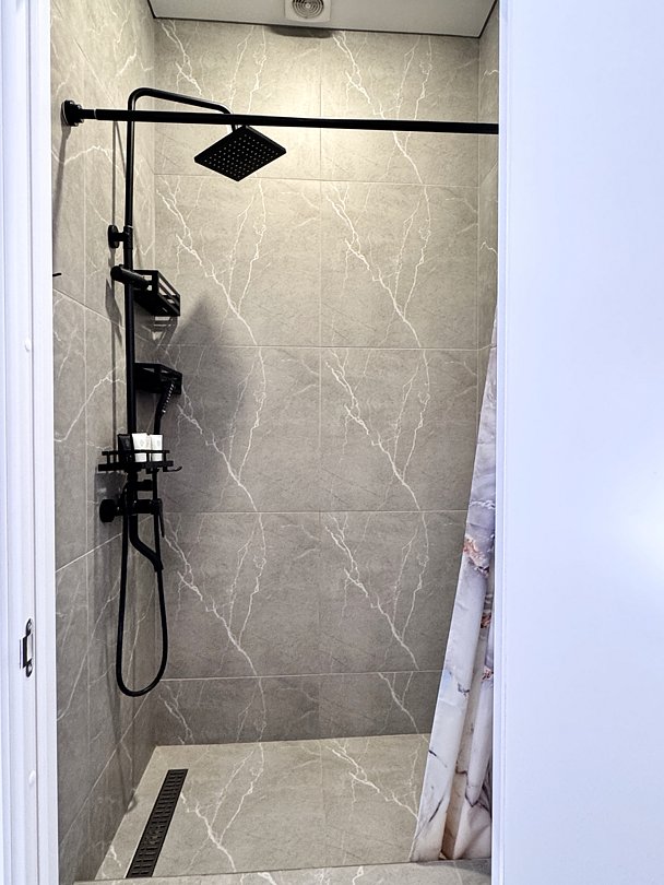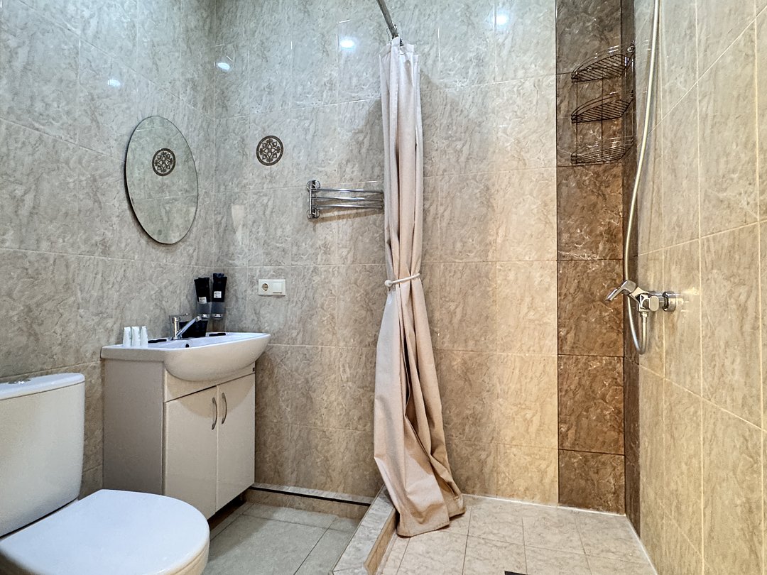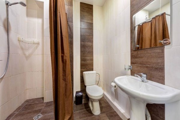 Санузел: душ, умывальник, зеркало, унитаз, фен, комплект полотенец, тапочки, набор гостиничной косметики.