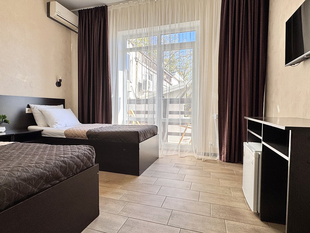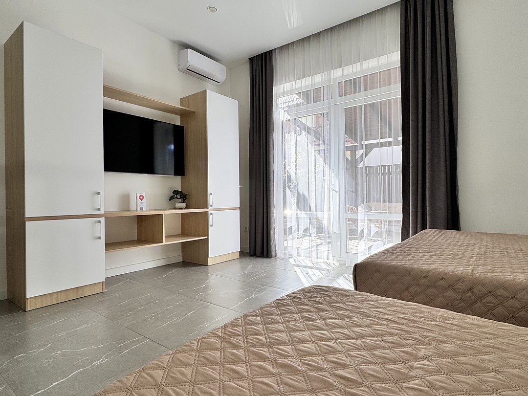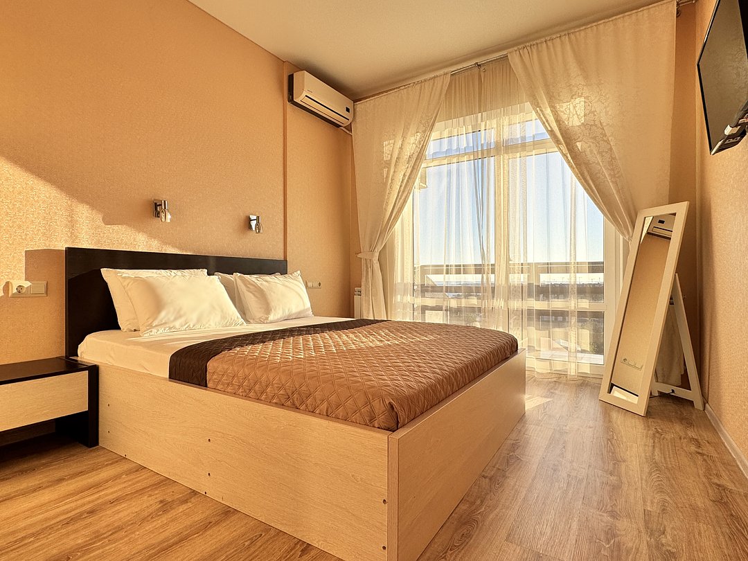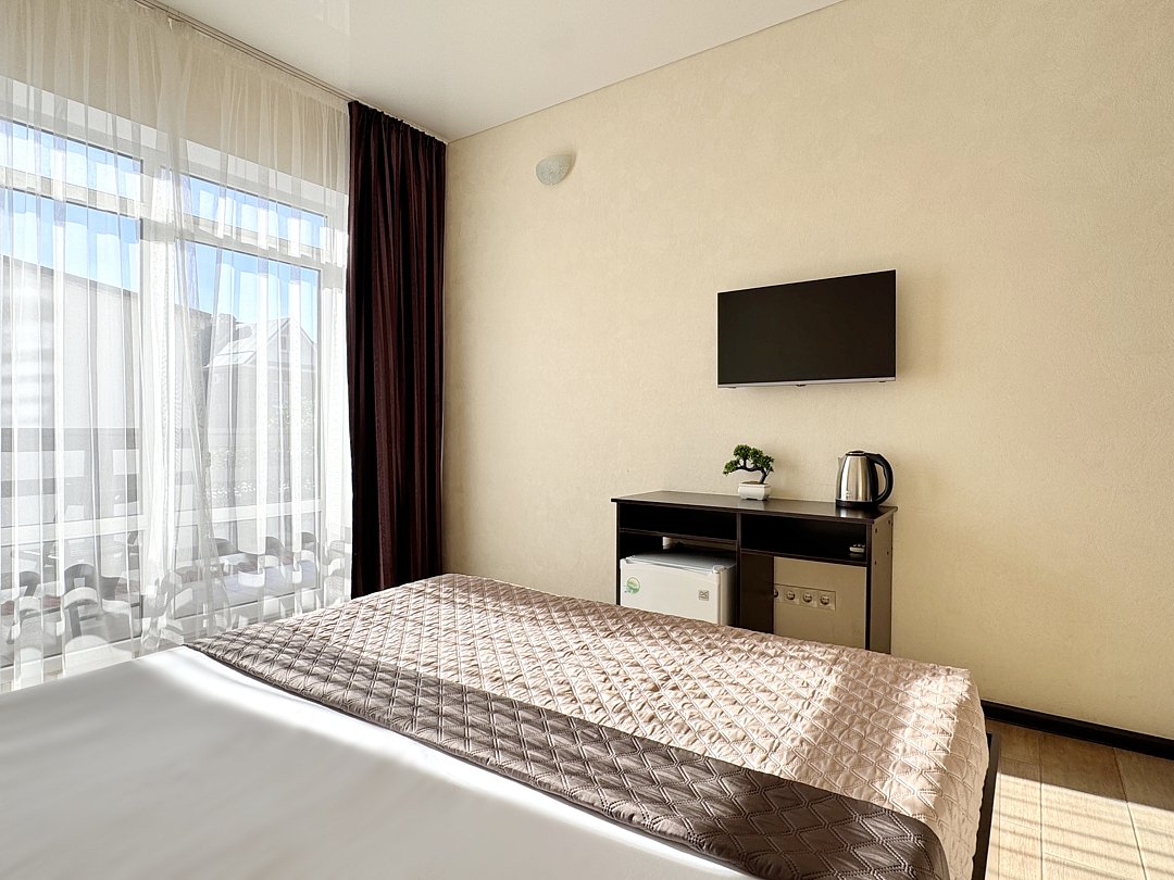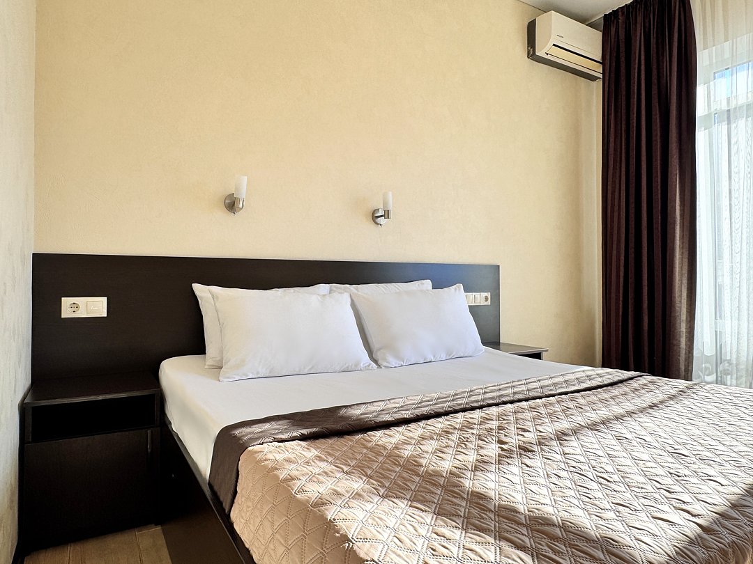 Однокомнатный номер без балкона. Номер оснащен: две односпальные кровати или двуспальная кровать, прикроватные тумбочки, прикроватные бра, туалетный столик, шкаф, вешалка, зеркало, электрический чайник, мини-холодильник, телевизор, кондиционер, шторы блэк-аут. Ванная комната: душ, зеркало, фен, комплект полотенец, тапочки, набор гостиничной косметики.