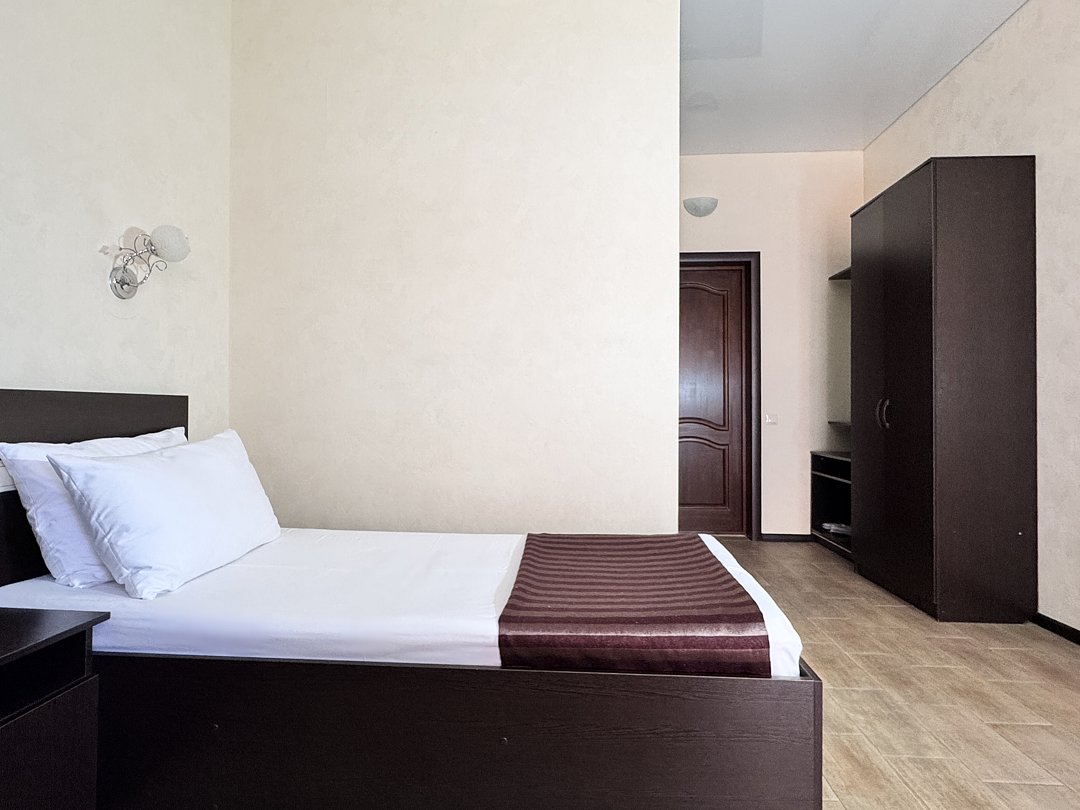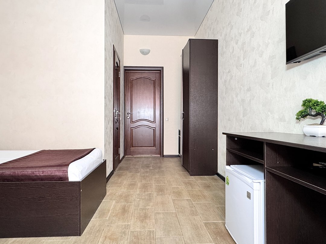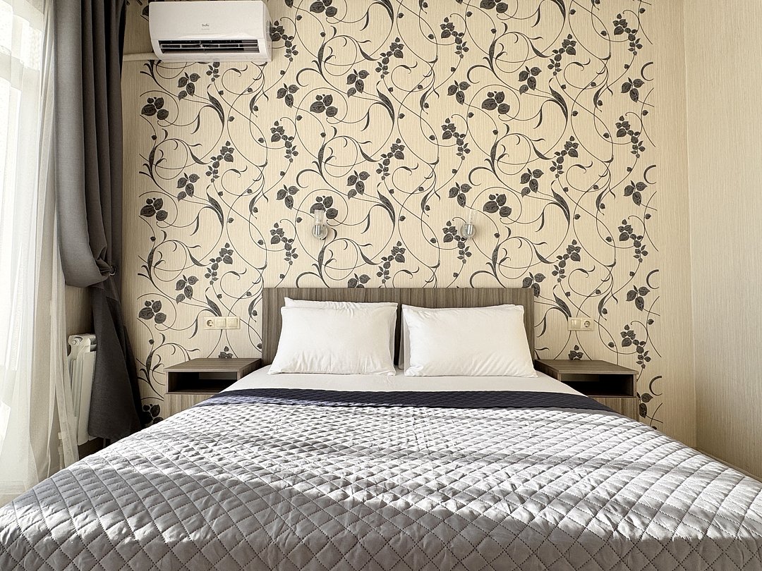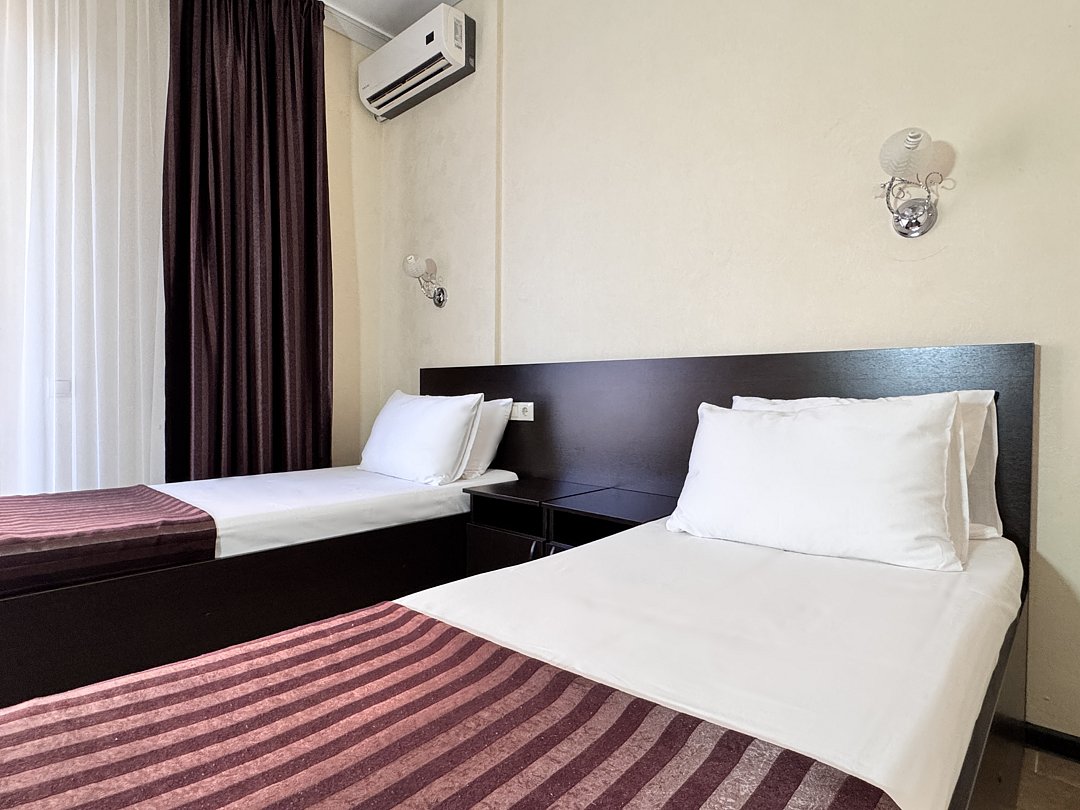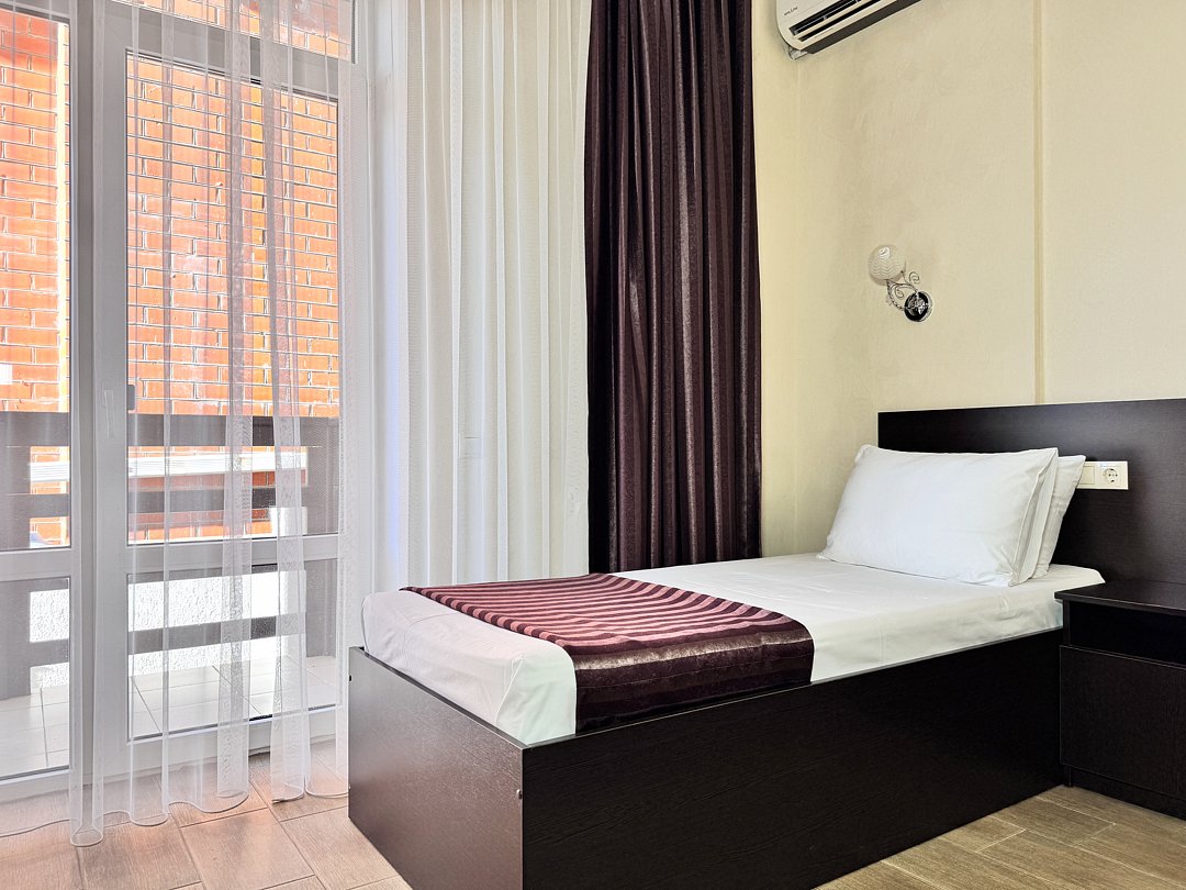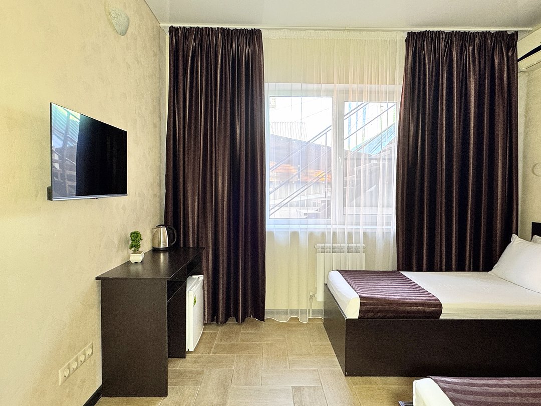 Однокомнатный номер без балкона. Номер оснащен: две односпальные кровати или двуспальная кровать, прикроватные тумбочки, прикроватные бра, туалетный столик, шкаф, вешалка, зеркало, электрический чайник, мини-холодильник, телевизор, кондиционер, шторы блэк-аут. Ванная комната: душ, зеркало, фен, комплект полотенец, тапочки, набор гостиничной косметики.