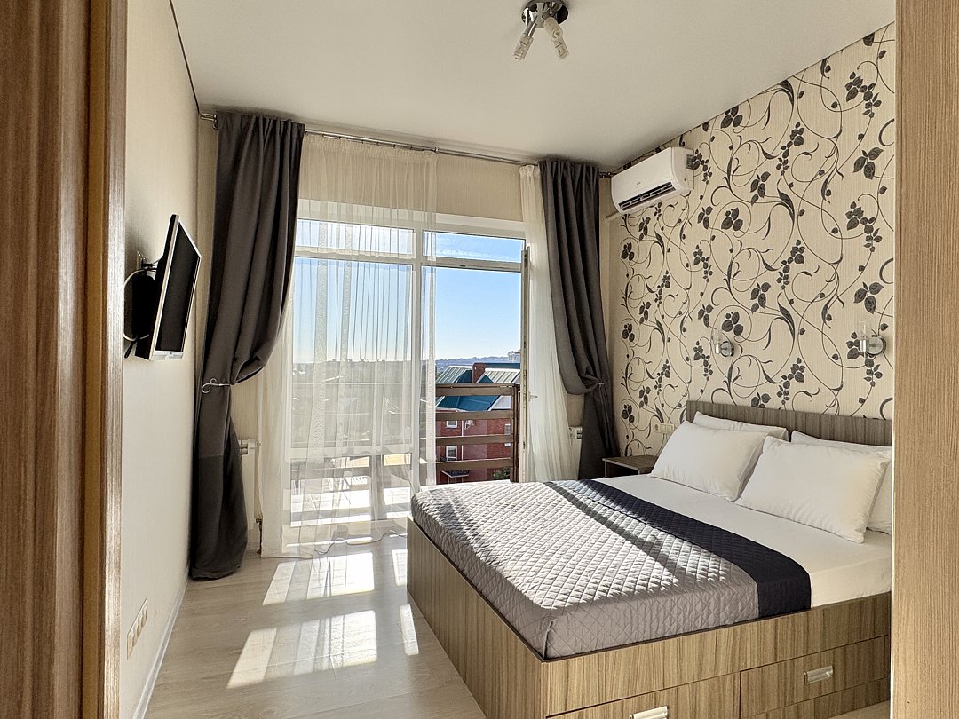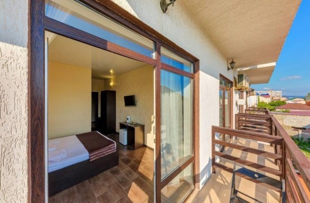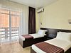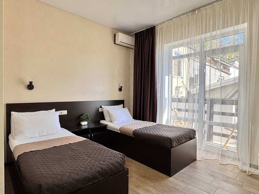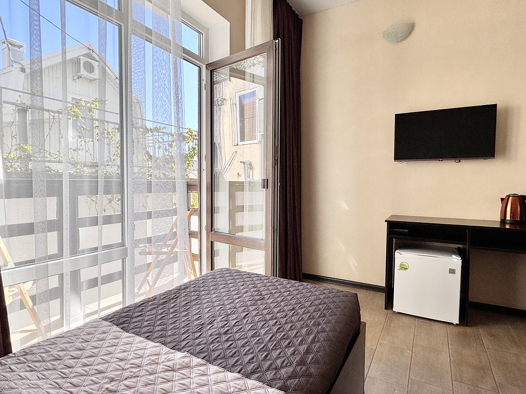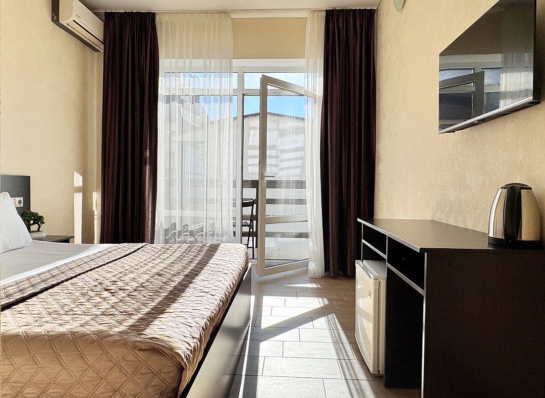 Двухместный номер с балконом. Номер оснащен: две односпальные кровати или двуспальная кровать, прикроватные тумбочки, прикроватные бра, туалетный столик, шкаф, вешалка, зеркало, электрический чайник, мини-холодильник, телевизор, кондиционер, шторы блэк-аут. Ванная комната: душ, зеркало, фен, комплект полотенец, тапочки, набор гостиничной косметики. Небольшой балкон, сушилка для белья.